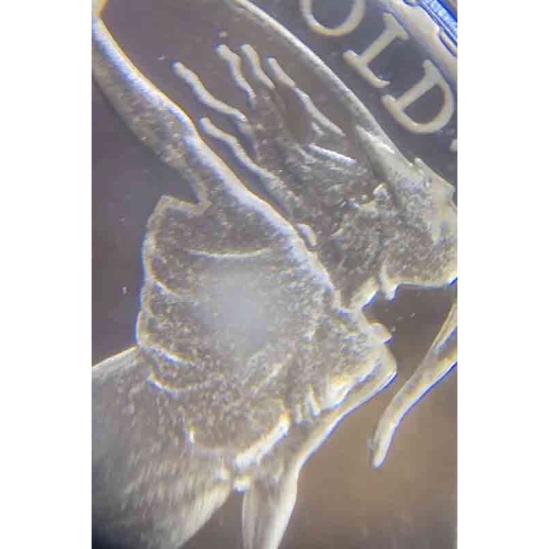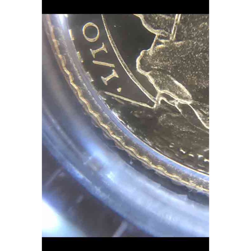 Il s’agit d’une pièce d’investissement anglaise qui présente un manque de métal flagrant dans la chevelure de Britania et un crénelage sur un quart de la pièce..