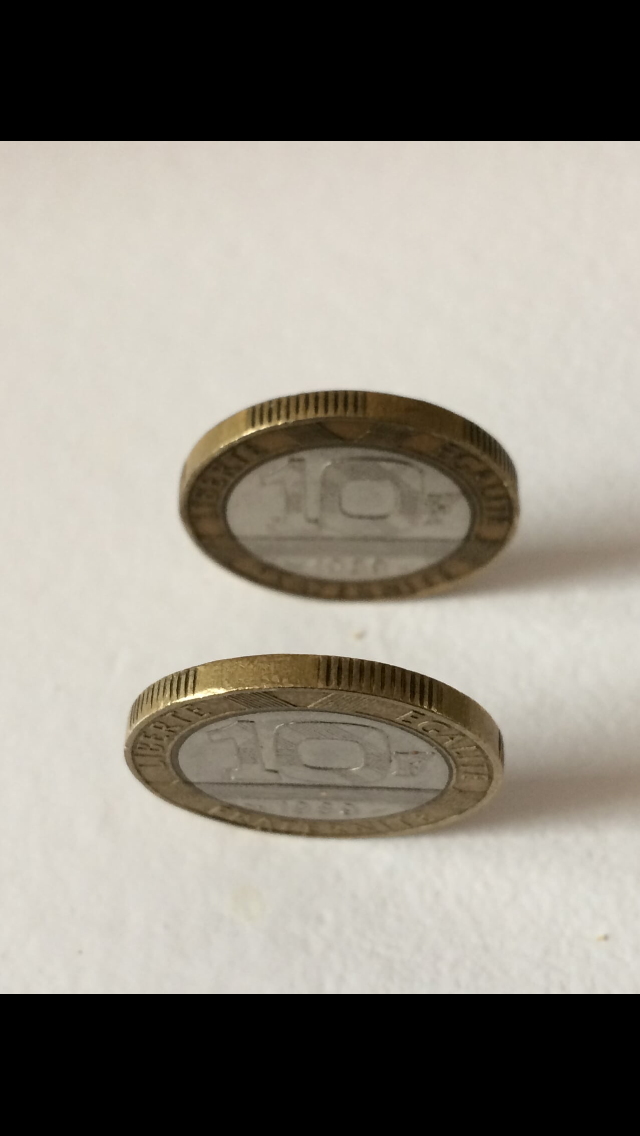 10 francs 13 cannelures (2 pièces) lorsque on met les pièces superposer l’image en face ,on obtient une tranche opposée .