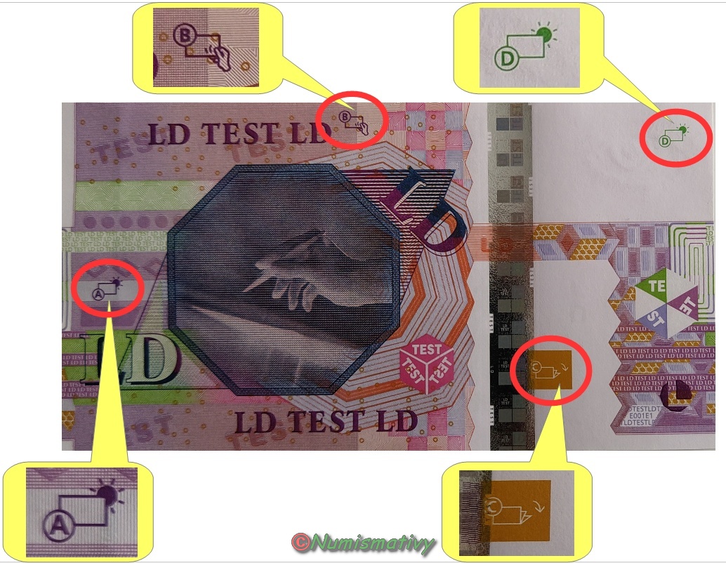 Les symboles sont légendés de A à F et apparaissent à différents endroits des billets, ces billets ne comportent qu'un seul N° de série.