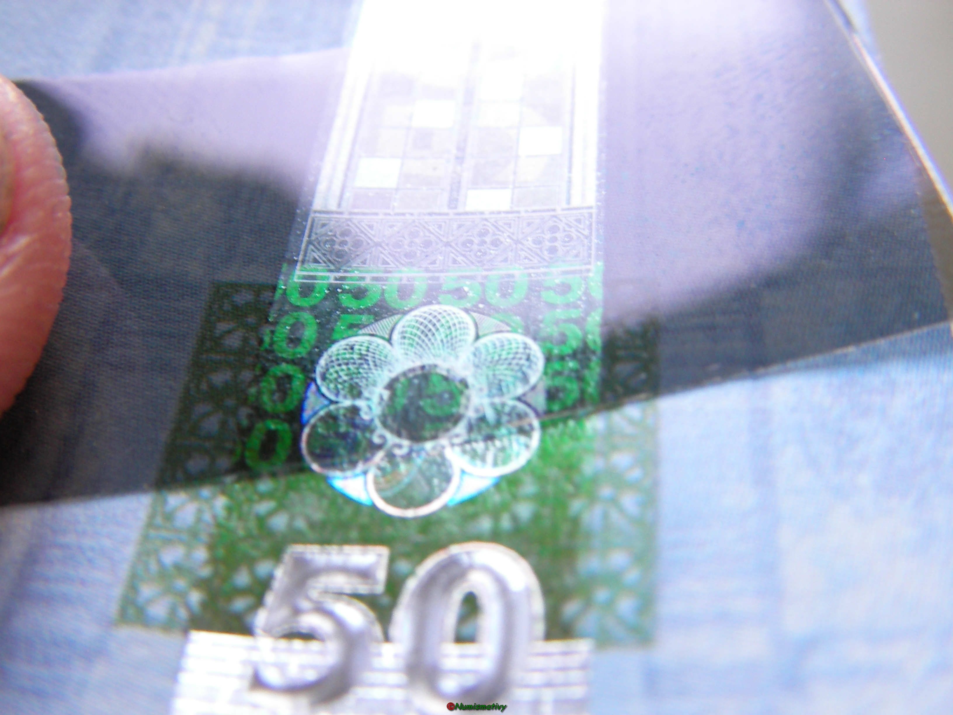 Test de bandes holographiques de sécurité. En 2006 une société Allemande à présenté son savoir faire en matière de sécurité, et a proposé 2 versions de straps sécurisés pour les futures versions (série 2 : EUROPE) de billets en EURO.