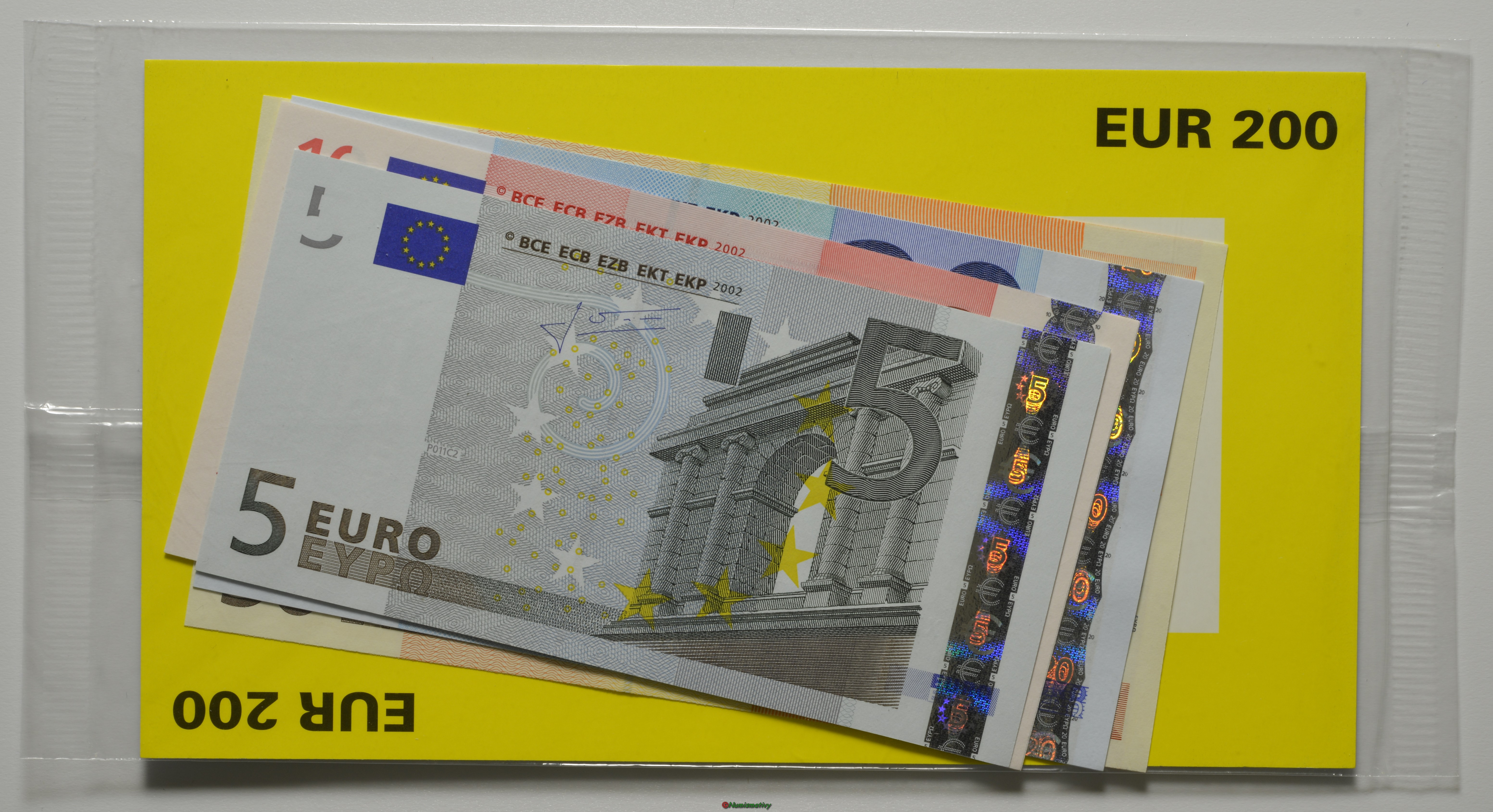 Au début de l'euro la banque HSBC distribuait des kits contenant des billets à leur clients qui partaient en voyage dans les pays de la zone euro. Pour le moment 2 types de pochettes ont été recensées.
