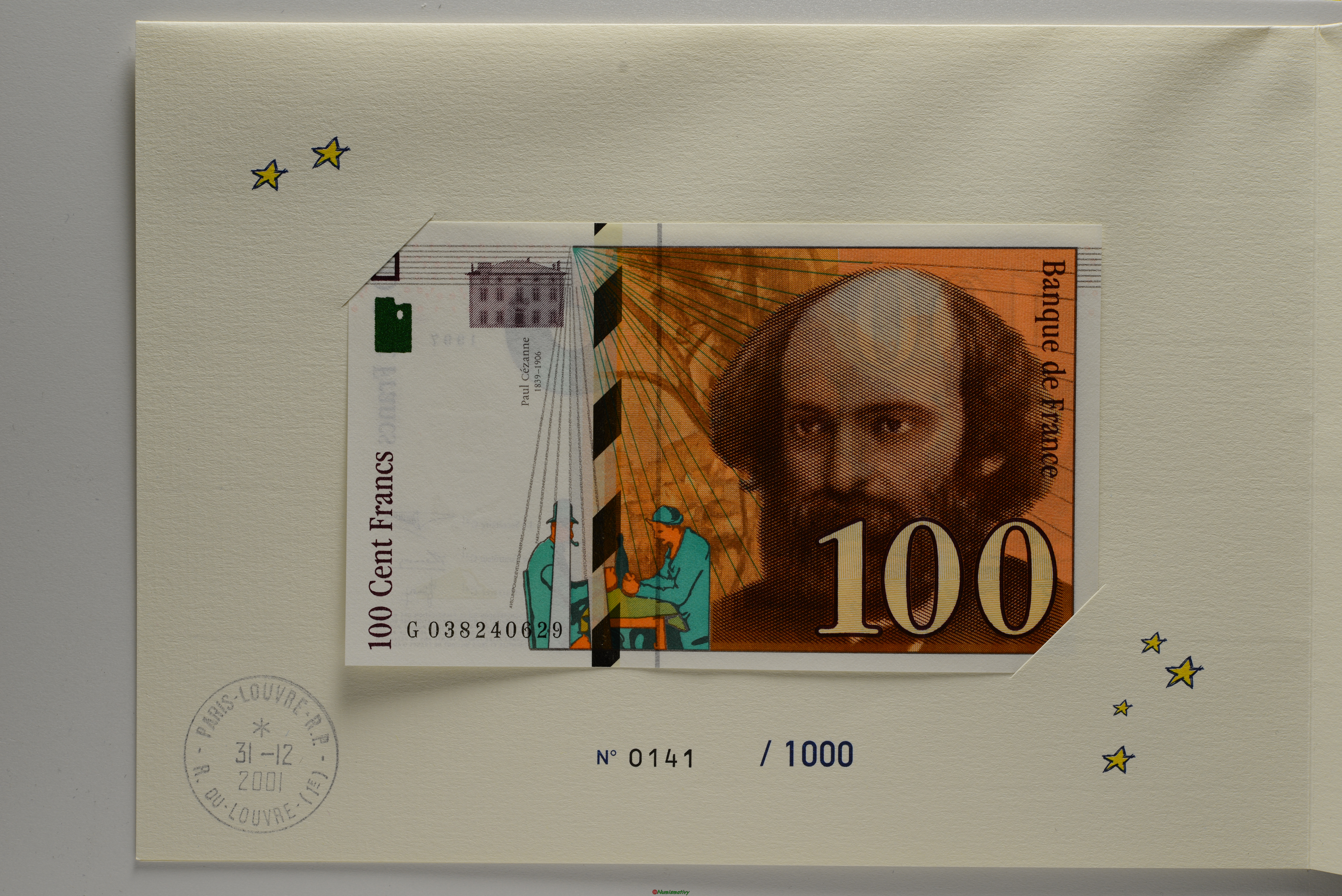 Le bureau de poste du Louvres à émis ce coffret spécial dans la nuit du 31 décembre 2001 au 1er Janvier 2002. IL contient un billet de 100 Francs et son équivalent en Euro, soit 15euros avec un billet de 10 euro et un de 5 euro.