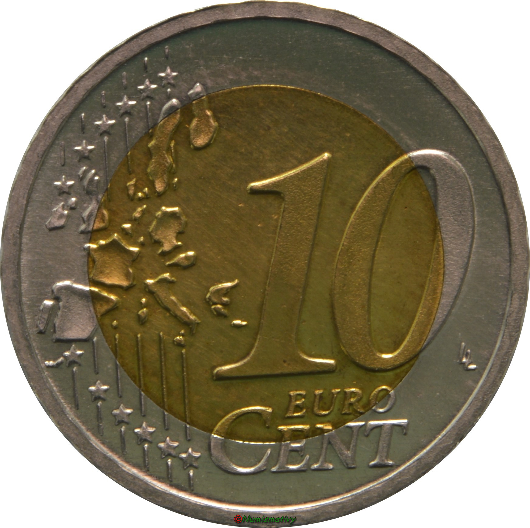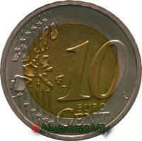 Voici 2 exemplaires de frappe de10 cent sur flans bimétalliques trouvées en Allemagne. Une double fauté (flans / coins) étant déjà très improbable pour une pièce, en trouver 2 valeurs faciales différentes nous conforte dans l'idée d'essais. A priori les ateliers de frappe Allemands ont procédés à des essais de leurs coins sur des flans non conformes.