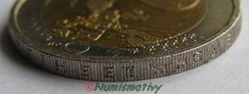 Les flans des premières 2€ sans date ont été cordonnés avec le matériel d'inscrustation des 5DM (surement car le matériel pour l'€ n'était pas encore pret) , mais une 5DM à un diamètre de 29mm tandis qu'une 2€ à un diamètre de 25.75mm seulement, du coup une partie de la tranche à été sur-incrustée sur 4 caractères.