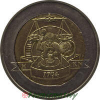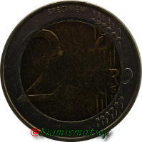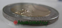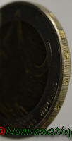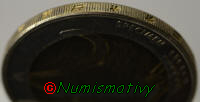 Voici enfin une 2€ avec une tranche autre qu'autrichienne : celle-ci est la tranche de la France, Belgique, ... à ceci près que la police de caractère des 2 ne sont pas conforment au type adopté. On remarque aussi que la frappe est faible et les reliefs peu marqués.