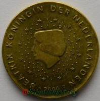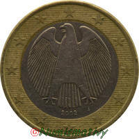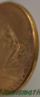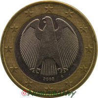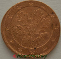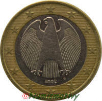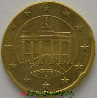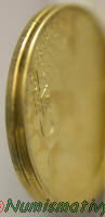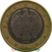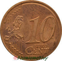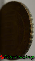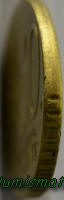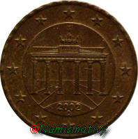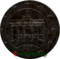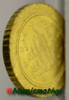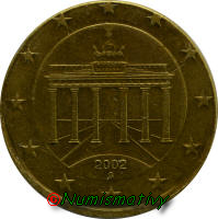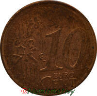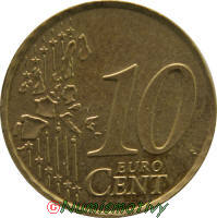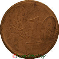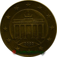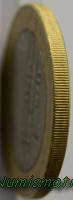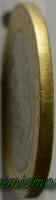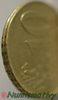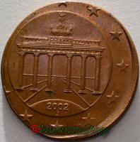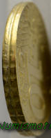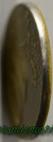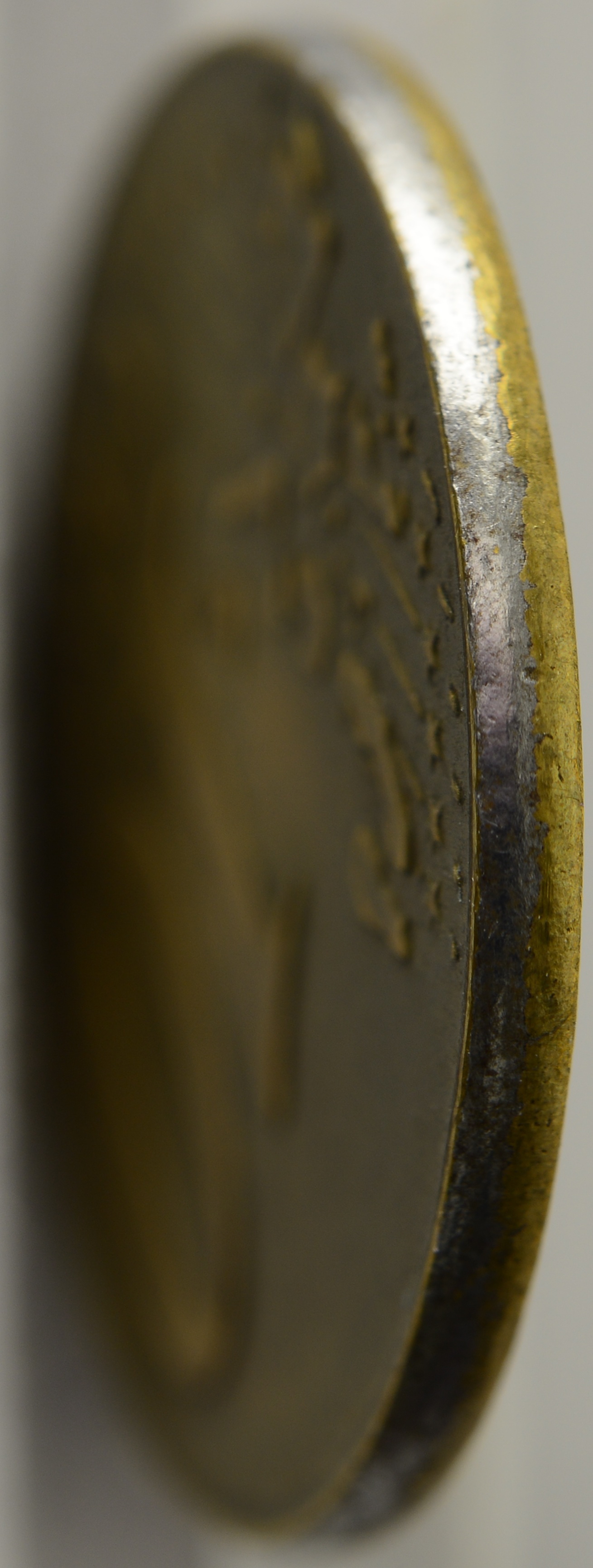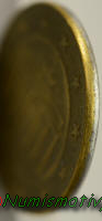 ALLEMAGNE Voici une 10cent 2002D Allemande frappée sur un flan de 5 Pfennig Allemand reconnaissable visuellement par le bandeau non cuivré de la tranche. Poids : 2.95g Flan : magnétique (acier plaqué laiton) |