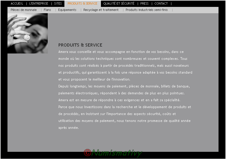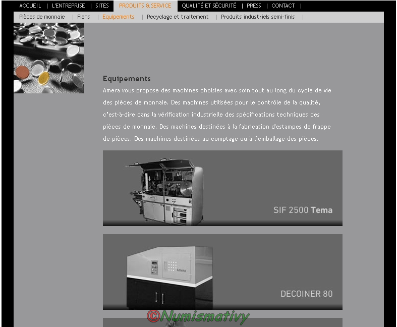 AMERA : Amera est une entreprise de production de flans destinés à la frappe de pièces revêtues par galvanoplastie avec du cuivre, du nickel, du laiton, du zinc et du bronze. Amera fabrique et vend, en collaboration avec ses partenaires, tous types de flans : bicolores, en acier inoxydable, en aluminium, en cupronickel (Cu-Ni), en Aluminium-Bronze (Cu-Al-Ni) ou encore en alliage de laiton ou en maillechort. Amera à un site Internt : https://www.amera.ch/