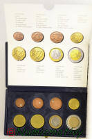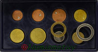 ![]() Coffret ouvert ![]() Détails de la fiche descriptive ![]() 1 et 2 euros non sertis ![]() 2 euro sans légende ![]() Sillon sur les inserts |