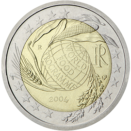 alimentaire mondial. À l'avant-plan figure le globe terrestre, incliné vers la droite et portant l'inscription WORLD FOOD PROGRAMME, d'où émergent un épi de blé, un épi de maïs et un épi de riz, représentant les sources d'alimentation de base dans le monde. À droite du globe, un I est superposé à un R, désignant la Repubblica Italiana. Au-dessous apparait une plus petite combinaison de lettres U et P, les initiales du graveur, Uliana Pernazza. Dans la partie supérieure gauche du globe apparait la marque d'atelier R et sous le globe, le millésime 2004. Les douze étoiles de l'Union européenne sont placées autour de l'anneau extérieur. Gravure sur tranche : 2 * Décembre 2004. 16 millions de pièces émises. |