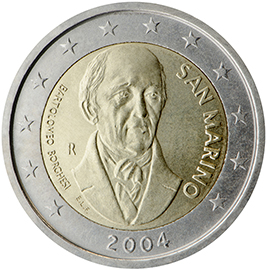 Borghesi (historien et numismate). Les douze étoiles de l'Union européenne placées sur le pourtour de la pièce et l'année d'émission 2004 en bas au centre entourent le buste de Bartolomeo Borghesi. À la gauche du buste figure l'inscription BARTOLOMEO BORGHESI, tandis que la lettre R et les initiales du graveur E.L.F. sont superposées. L'inscription SAN MARINO apparaît à la droite du buste. Gravure sur tranche : 2* Décembre 2004. 110 000 pièces émises. |