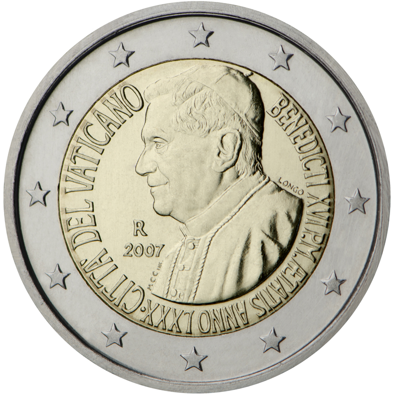 Description : sur la partie interne de la pièce est représentée, de profil, Sa Sainteté le pape Benoît XVI, la tête tournée vers la gauche. La légende « BENEDICTI XVI P.M. AETATIS ANNO LXXX CITTA' DEL VATICANO » est gravée à la bordure de la partie interne de la pièce. À gauche de l'effigie apparaissent la marque d'atelier « R », l'année d'émission « 2007 » et les initiales du graveur « M.C.C. INC. » tandis que le nom de l'artiste « LONGO » est inscrit à sa droite. Les douze étoiles de l'Union européenne figurent dans l'anneau externe de la pièce.