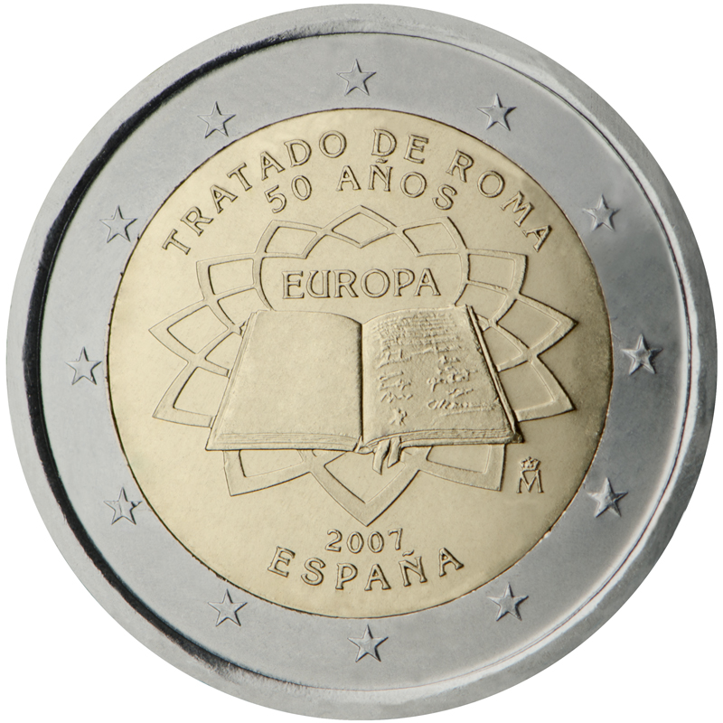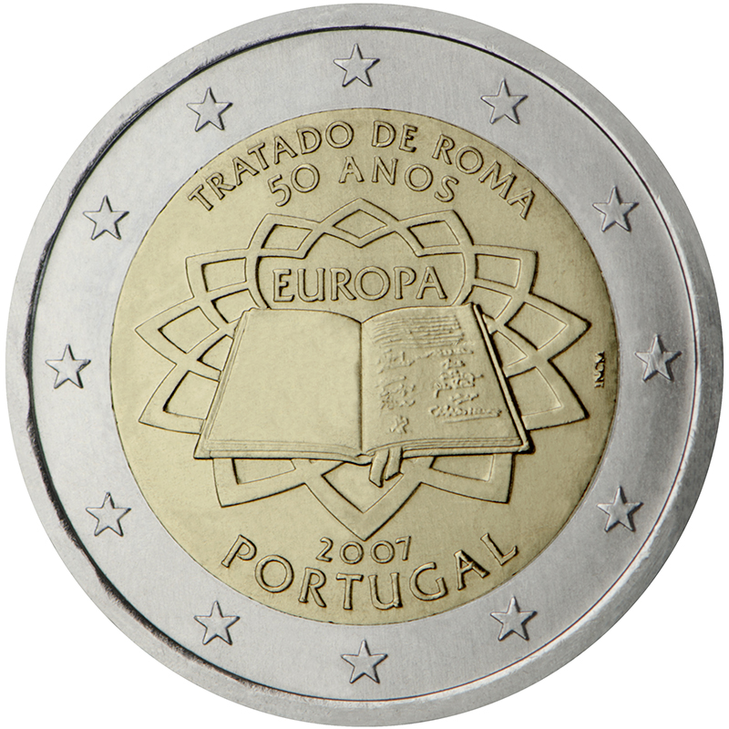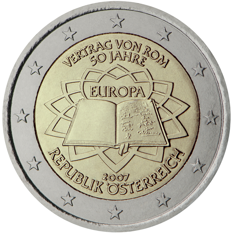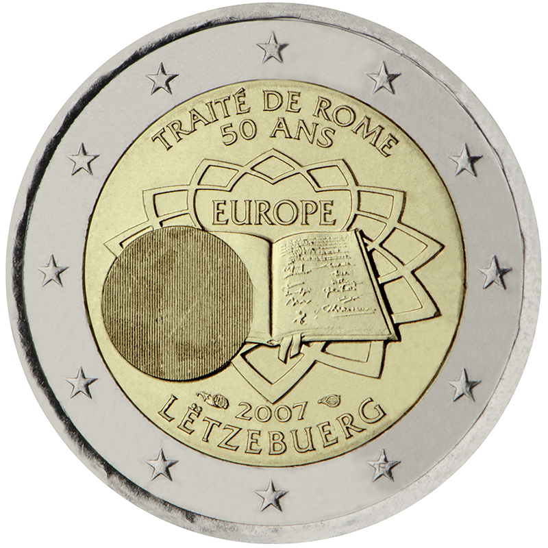 Description : la pièce montre le traité signé par les six pays fondateurs, avec en arrière-plan le motif du dallage (dessiné par Michelangelo) de la Piazza del Campidoglio à Rome, où a eu lieu la cérémonie de signature le 25 mars 1957. Les inscriptions « TRAITE DE ROME 50 ANS » et « EUROPE » ainsi que le nom du pays émetteur apparaissent dans les langues respectives de la zone euro ou en latin. Par conséquent, la légende diffère d’un pays à l’autre, mais le dessin est le même. Le traité de Rome a institué la Communauté économique européenne et a préparé la voie de l’introduction de l’euro en 1999 et des billets et pièces en euros en 2002. L’anniversaire sera célébré le 25 mars 2007. À cette occasion, les pays de la zone euro ont décidé d’émettre conjointement cette pièce commémorative. Son dessin a été choisi à l’issue d’un concours organisé par les hôtels des monnaies européens. Les douze étoiles de l’Union européenne sont représentées dans l’anneau externe de la pièce.