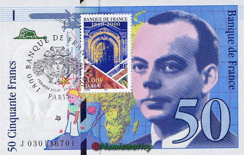 Quelques billets commémoratifs ont été surchargés d'un timbre et d'une oblitération "premier jour" datant du 15 Janvier 2000. Cette commémoration fête les 200 ans de la Banque de France (1800-2000).