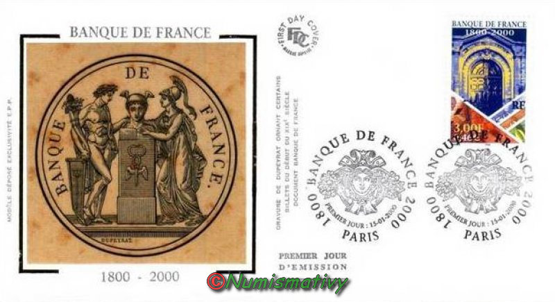 A l'occasion des 200ans de la Banque de France, un timbre à été édité, et une oblitération "premier jour" à été tamponnée sur certains timbres pour cette commémoration.