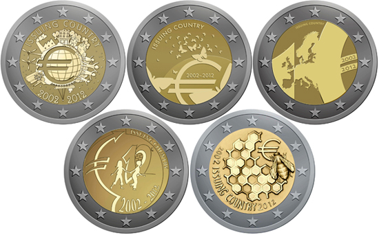 Bruxelles, le 30 juin 2011 : Les citoyens et résidents de la zone euro ont choisi le dessin de la nouvelle pièce qui sera frappée en janvier 2012 pour fêter les dix ans des pièces et billets en euros. Près de 35 000 personnes ont voté en ligne pour choisir, parmi cinq dessins présélectionnés par un jury professionnel, le gagnant d’un concours de dessins qui était ouvert aux citoyens de toute la zone euro. La nouvelle pièce commémorative de 2 euros sera émise par tous les États membres de la zone euro. On estime qu'environ 90 millions de ces pièces seront mises en circulation.