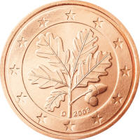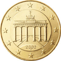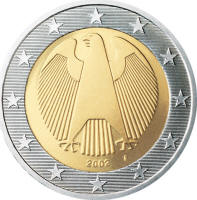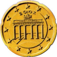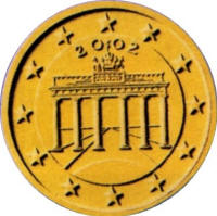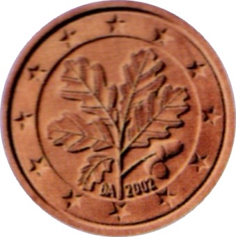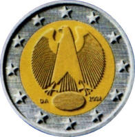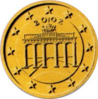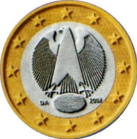 Cette préversion ne comporte pas les lettres des ateliers [A, D, F, G, J] mais l'indication "DA" près de la date, laquelle est désormais centrée sous l'Aigle. On aperçoit également un ovale sous l'Aigle qui fait fortement penser à un hologramme (comme sur les pièces 2€ commémoratives du Traité de Rome du Luxembourg). Aurait-il été question pour les Allemands que les pièces de 1 et 2 euros comportent un tel hologramme, ou cet ovale est-il un simple socle pour l'Aigle ? |
