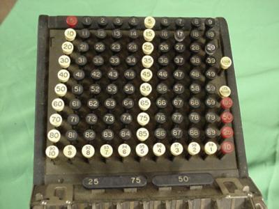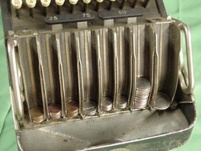 Machine Américaine qui donne la monnaie en appuyant simplement sur une touche. L'objet date des années 1930 :