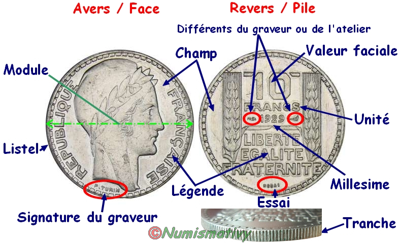 | Tranche | épaisseur de la pièce : surface périphérique de la pièce pouvant être lisse, cannelée, comporter des signes ou inscriptions en creux ou en reliefs. | |