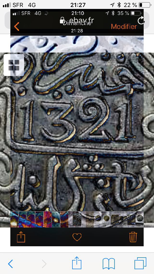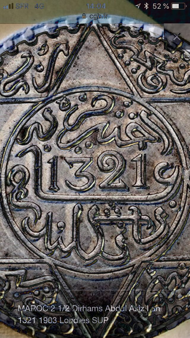 :roll: Bonjour je vous presente :!: cette pièce de 2 1/2 dirhams 132 1 avec le dernier 1 surélevé.Ainsi que le 2 décalé vers le haut .Sur les pièces de Londres la Fin de la date 21 est plus basse on peut remarquer en regardant les motif autour ...cette pièce présente ces défauts.