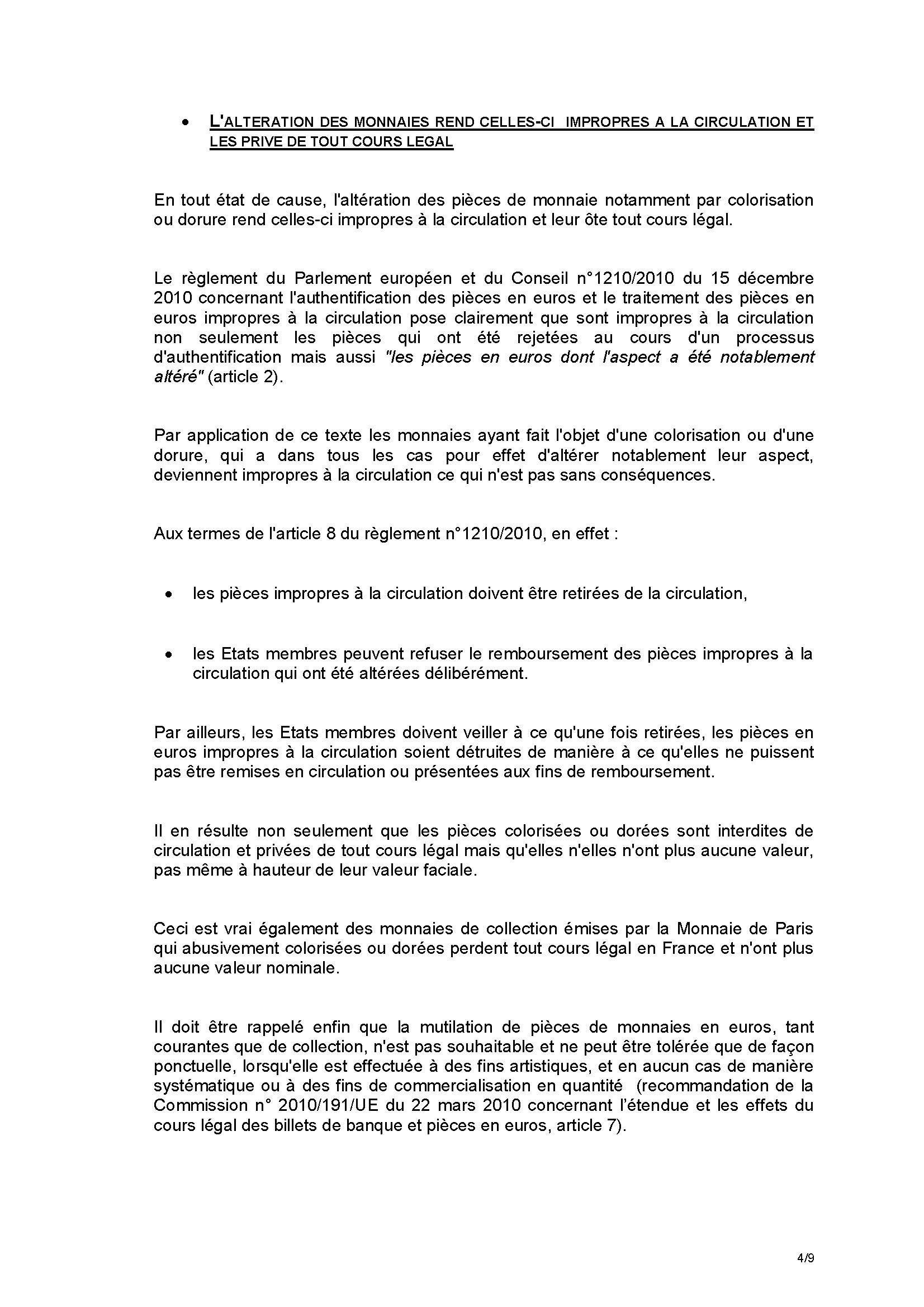 · L'altération des monnaies rend celles-ci impropres à la circulation et les prive de tout cours légal