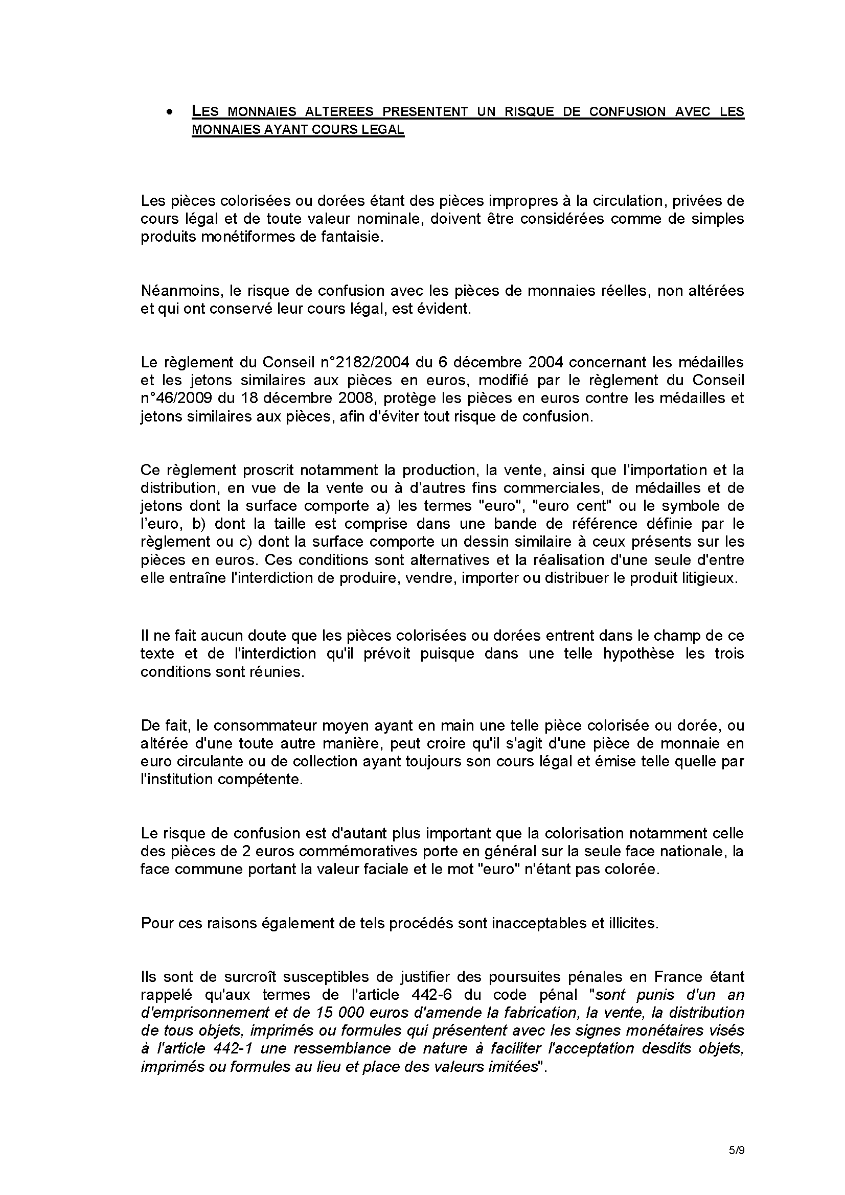 De nombreuses monnaies émises par la Monnaie de Paris font l'objet d'altérations par colorisation ou par dorure et sont revendues au public sous cette forme altérée. Ces pratiques, qui touchent en particulier les pièces de 2 euro commémoratives ainsi que certaines pièces de collection, sont illégales. Elles contreviennent aux droits de propriété intellectuelle, ainsi qu'à de nombreuses dispositions légales et règlementaires, de droit interne et communautaire, régissant le statut et l'apparence des pièces en euros :