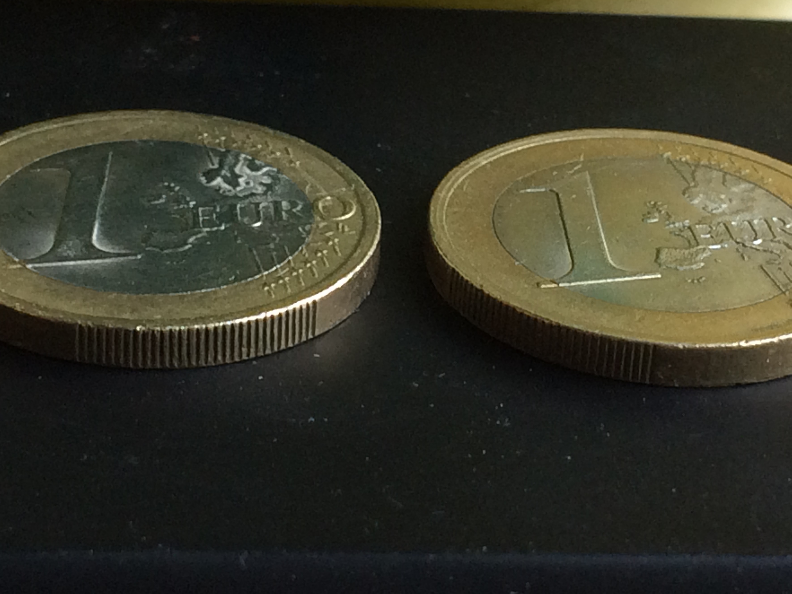 ici j'ai 5 pièces de 1€ (mais de pays différents) il il n'y en a pas 2 qui ont les stries au meme endroit...