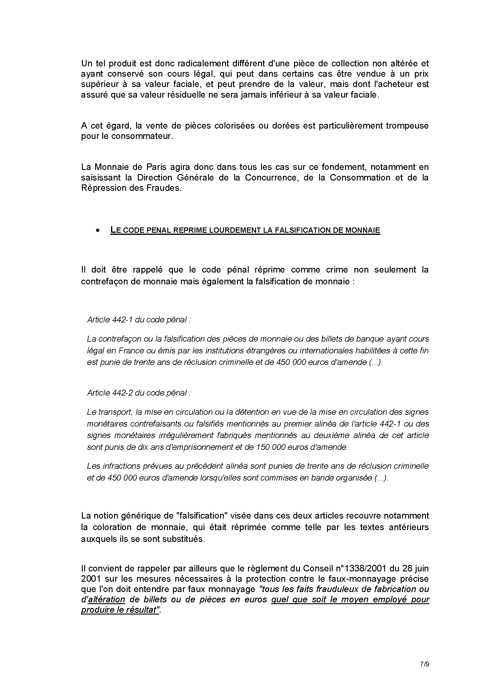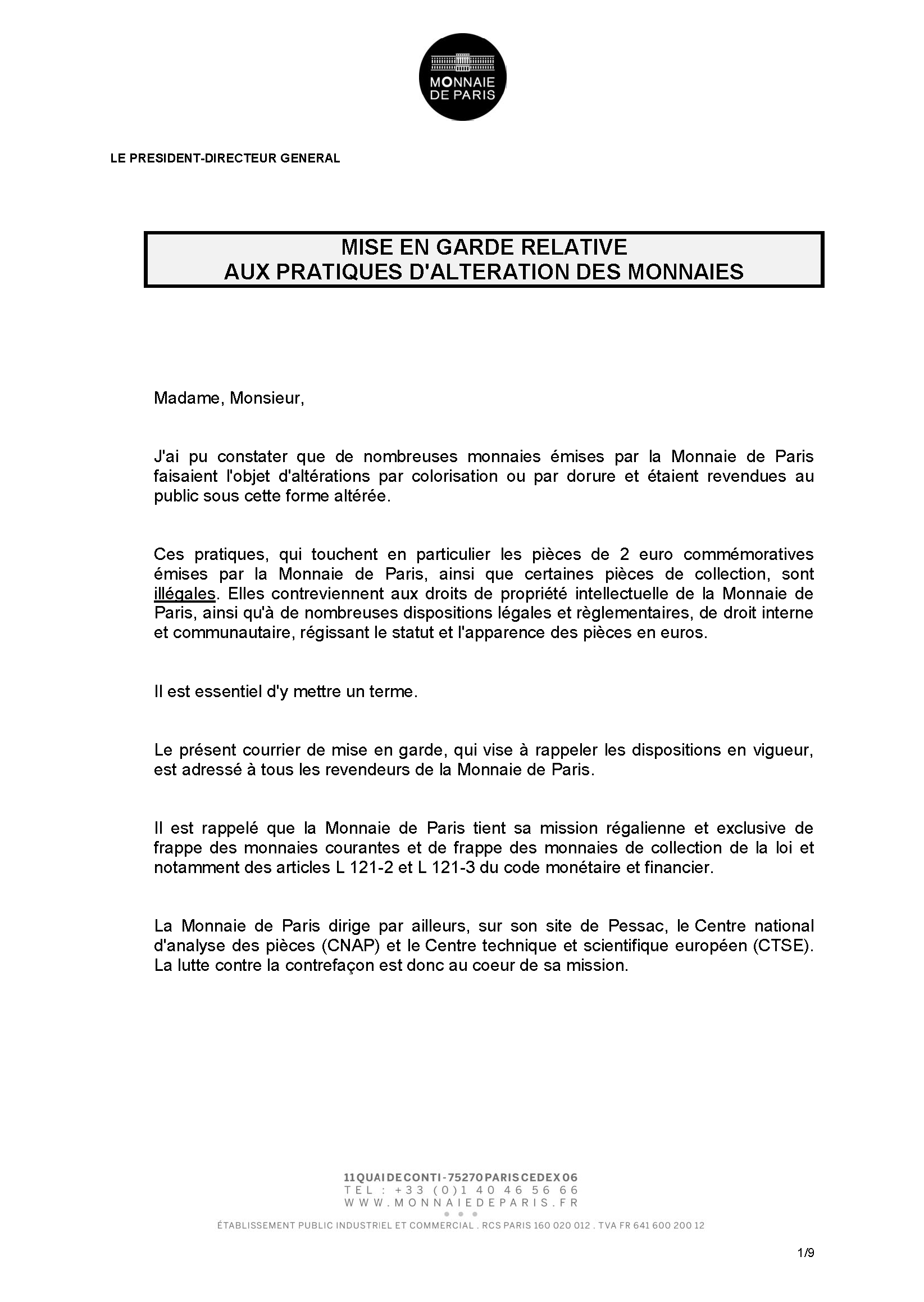 Veuillez trouver ci-joint un communiqué de la Monnaie de Paris relatif à la lutte contre les pratiques d’altération des monnaies. Le présent courrier de mise en garde, qui vise à rappeler les dispositions en vigueur, a également été adressé à tous les revendeurs français et étrangers de la Monnaie de Paris.