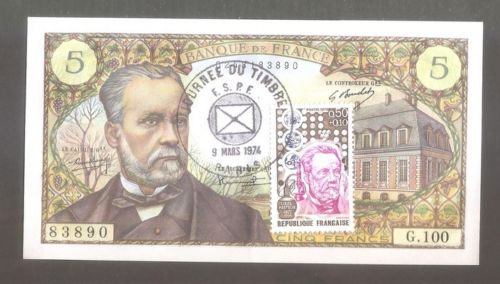 voici le billet de 5 Francs PASTEUR avec le N° 83890 G100 qui a la particularité d'avoir un timbre Pasteur et une oblitération de la journée du timbre le 9 mars 1974.