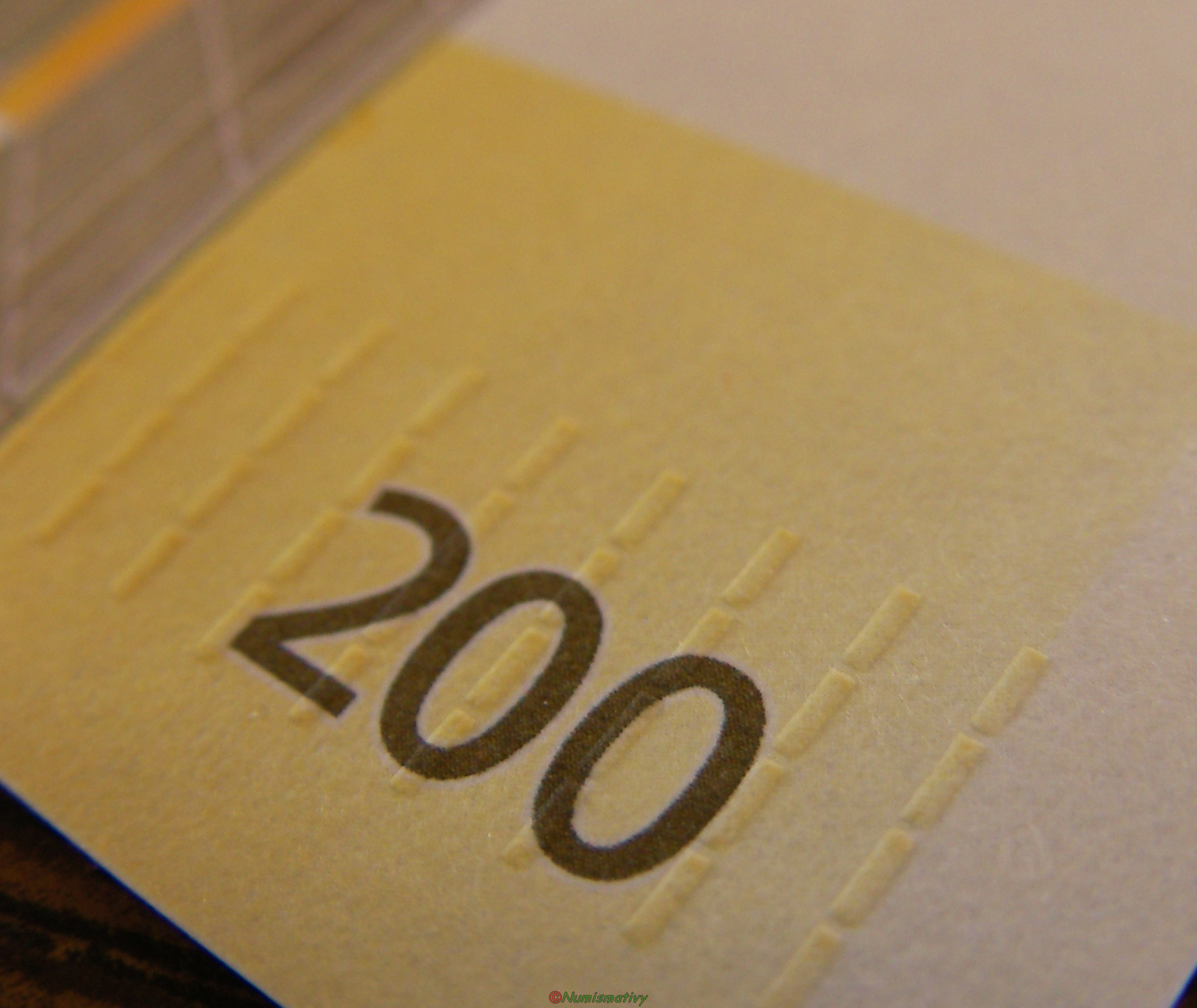 gros plan sur les détails d'un billet de 200 euros : impression avec reliefs