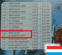 Erreur de descriptif sur le coffret BU Luxembourg 2002 : Le descriptif indique à tord que la 50 cent € est en "métal cuivrée", alors qu'elle est en "or nordique" ! [Pour en savoir plus cliquez ici...] |