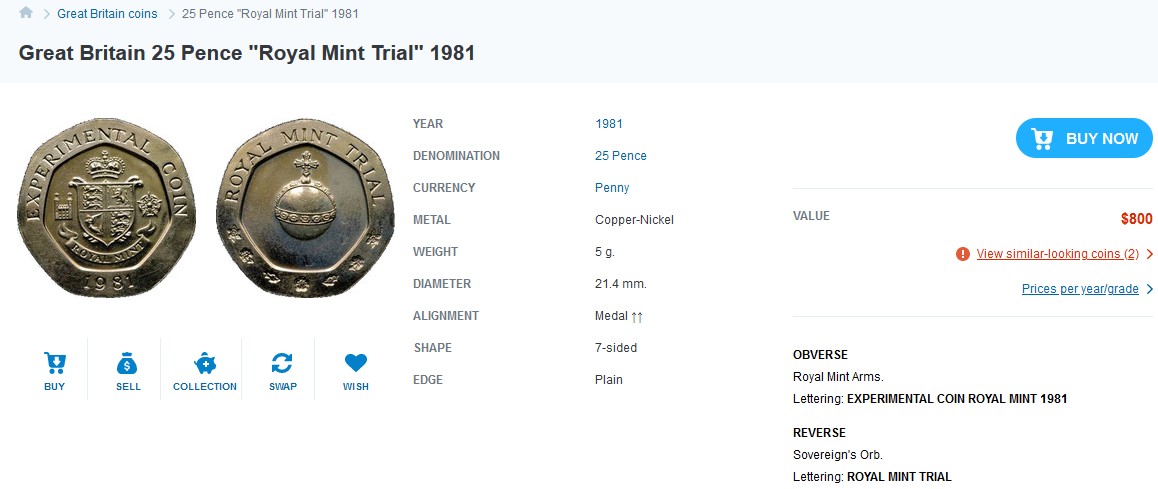 et ici un annonce trouvée sur le Net, avec le même visuel que la 20 cent euro, mais ici nous avons un essai de 25 pence avec un poids de 5g et un diamètre de 21.4mm.