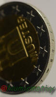 Pas d'information officielle non plus... mais le lien avec l'euro est bien plus évident qu'avec la 20cent, en effet celle-ci est bimétallique, et à une tranche légendée très proche de celle des 2 €, de plus une version avec les caractéristiques adoptées à été frappée.Pourquoi une légende différente??