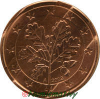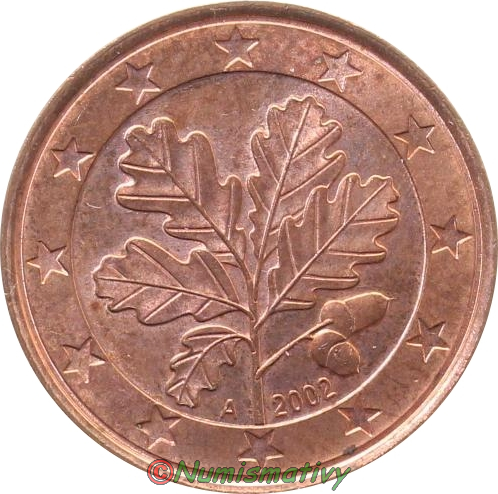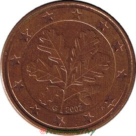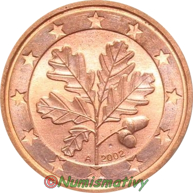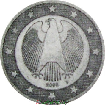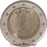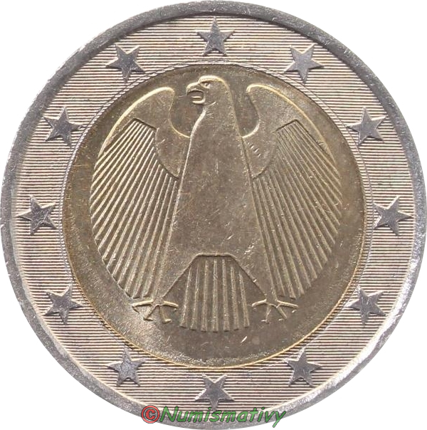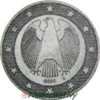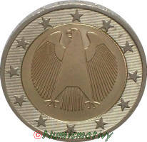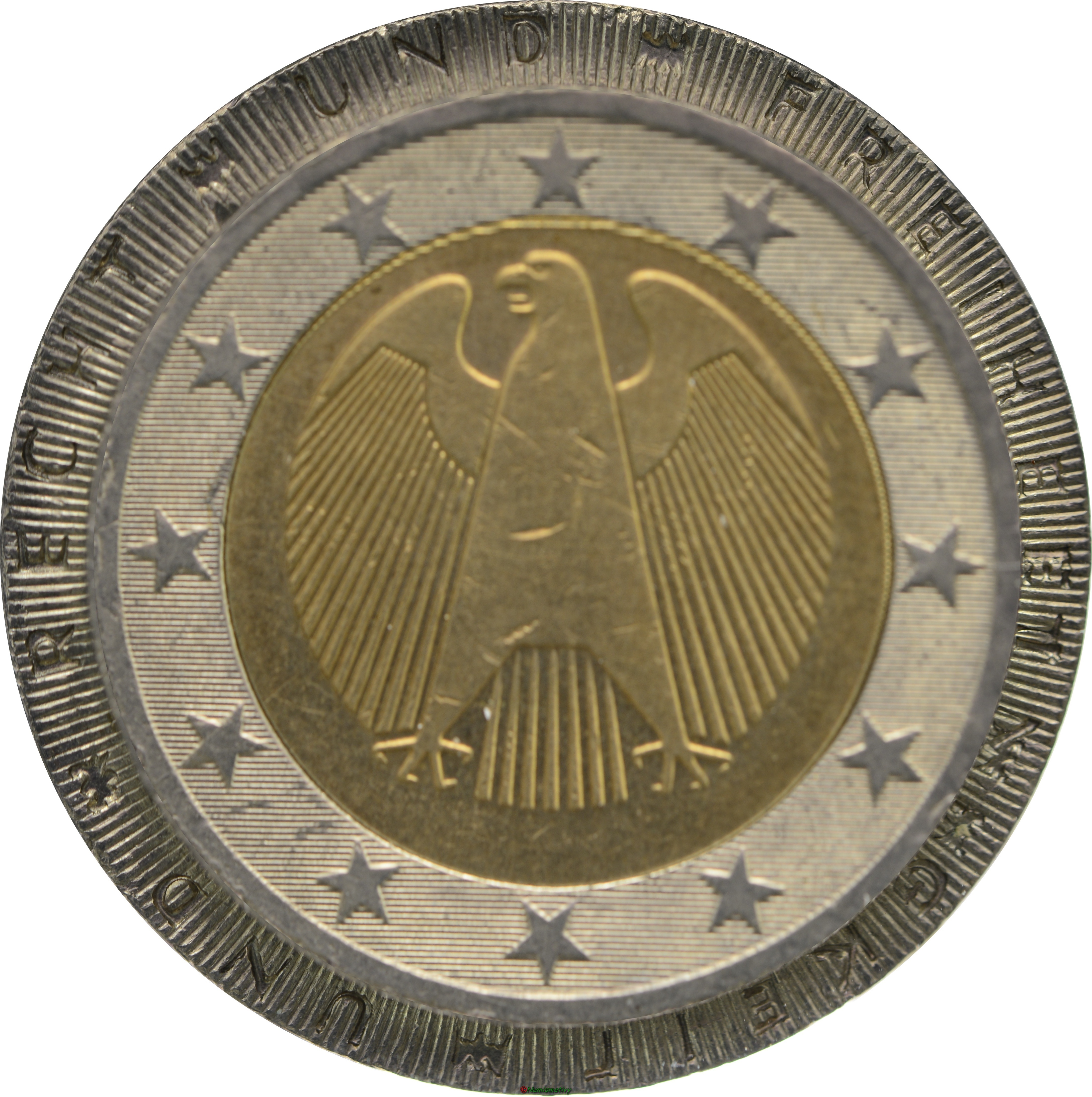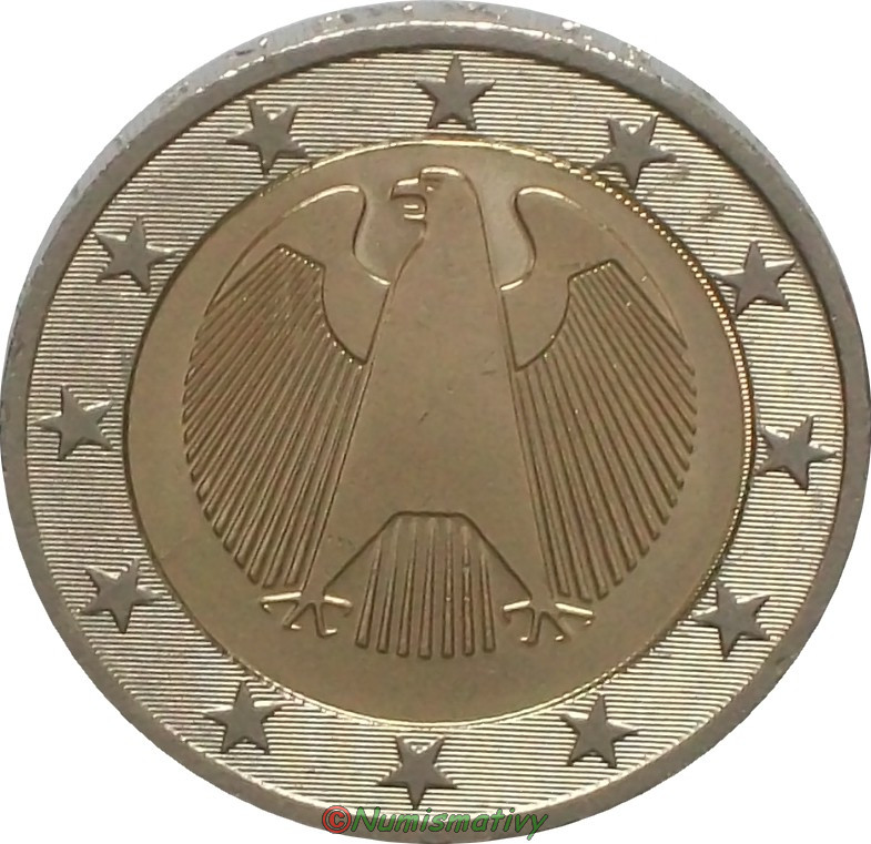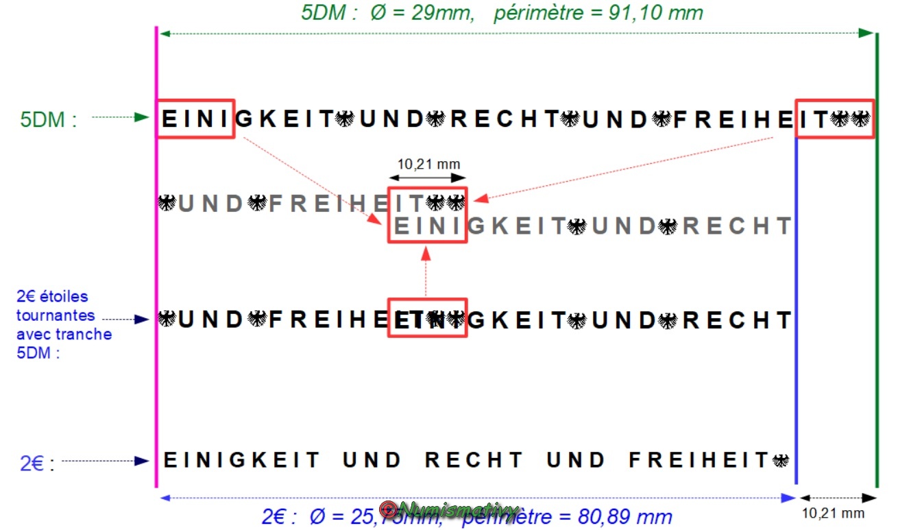 Afin que la légende (la devise allemande) passe sur la circonférence de ce flan de 2€ plus petit qu'une 5DM, la police de caractère est plus petite et il y a 1 seul symbole de l'aigle à la place des 6 sur la 5DM.