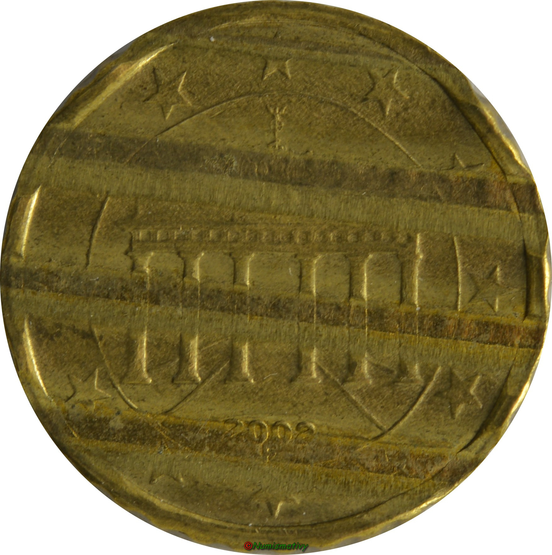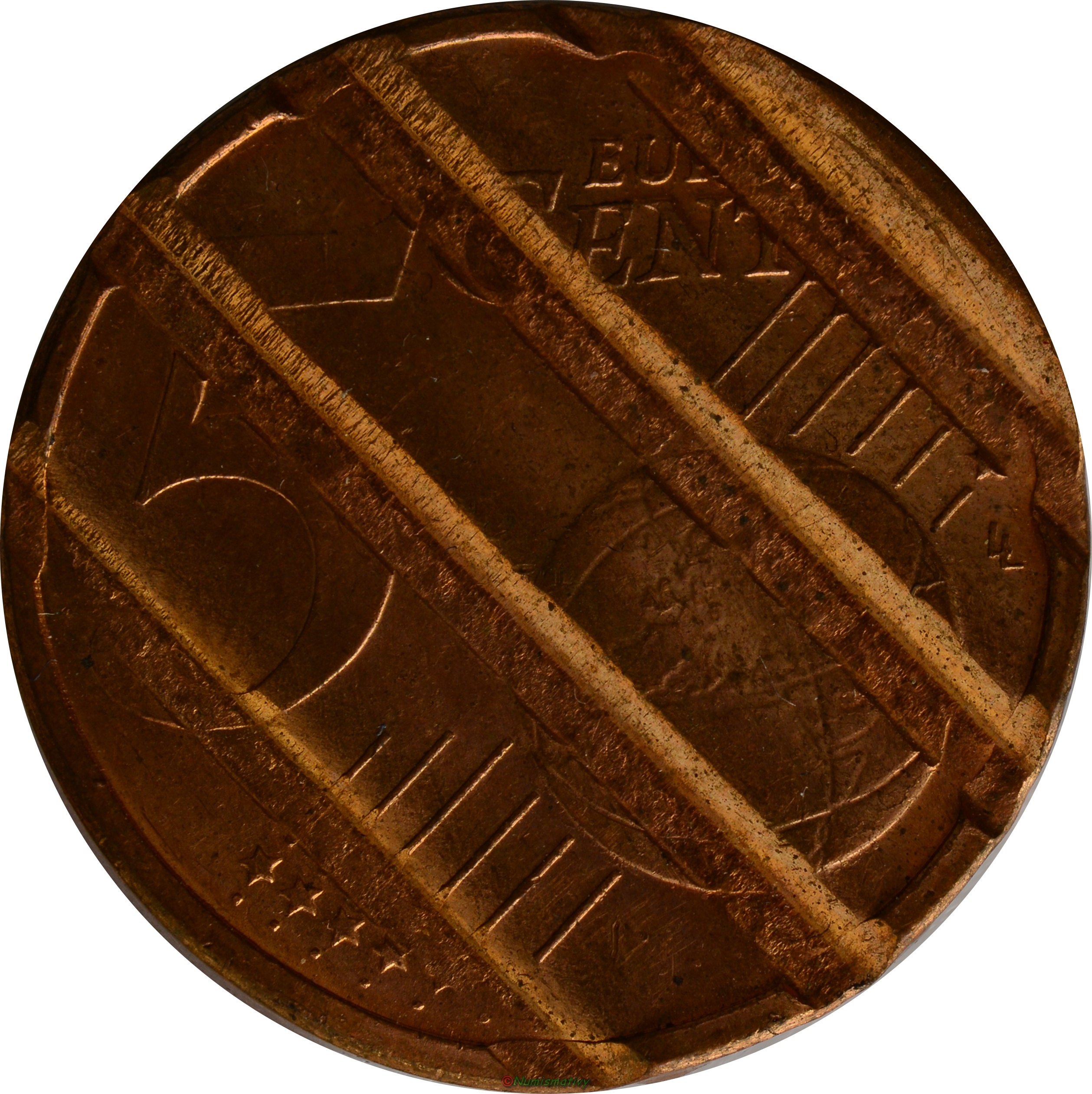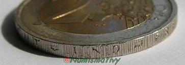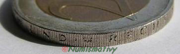 Les flans des premières 2€ sans date ont été cordonnés avec le matériel d'inscrustation des 5DM (surement car le matériel pour l'€ n'était pas encore pret) , mais une 5DM à un diamètre de 29mm tandis qu'une 2€ à un diamètre de 25.75mm seulement, du coup une partie de la tranche à été sur-incrustée sur 4 caractères.