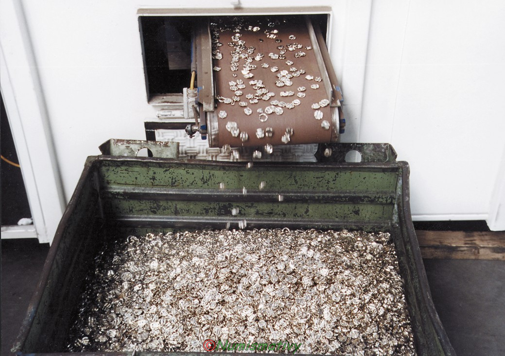 Si certaines pièces sont déformées, c'est parce qu'elles ont été récupérées entre l'étape de destruction (déformation dans des mâchoires mécaniques) et l'étape de fonte (chez le fondeur). En effet toutes les monnaies destinées à la fonte sont déformées avant de quitter les ateliers de frappes de façon à éviter qu'ils ne se retrouvent sur le marché en tant que monnaies de paiement.