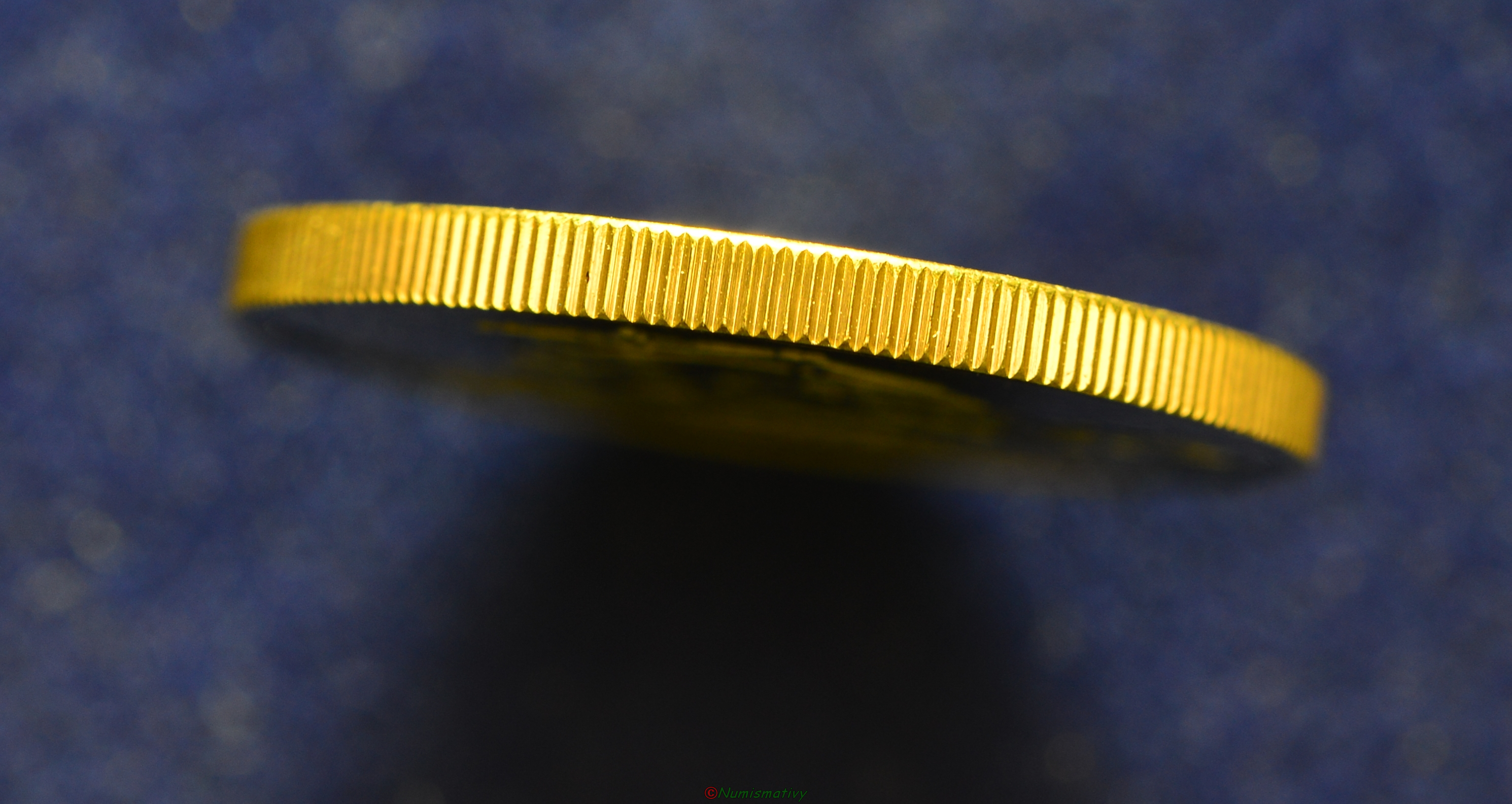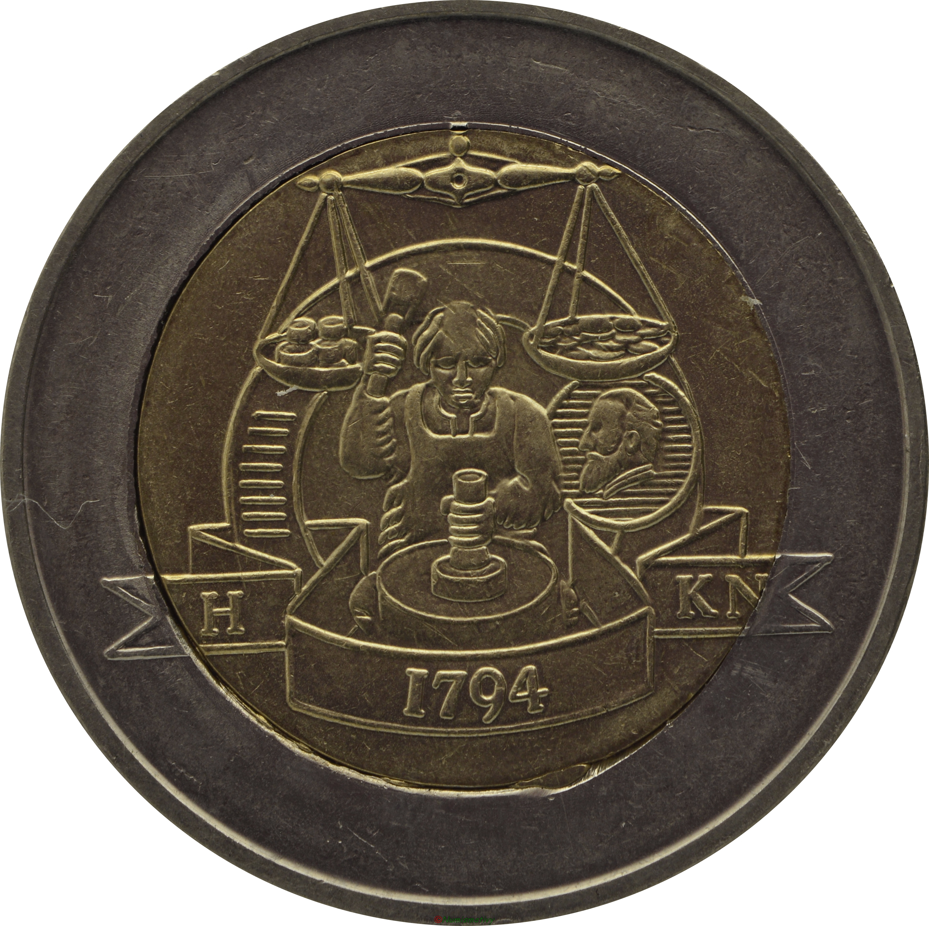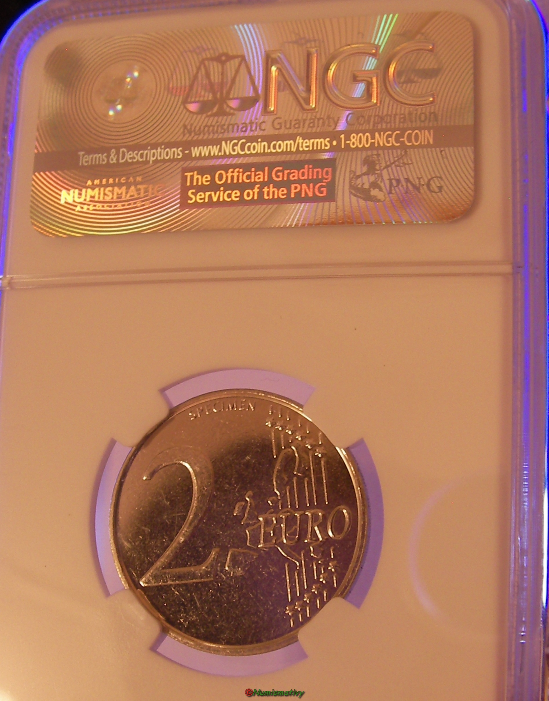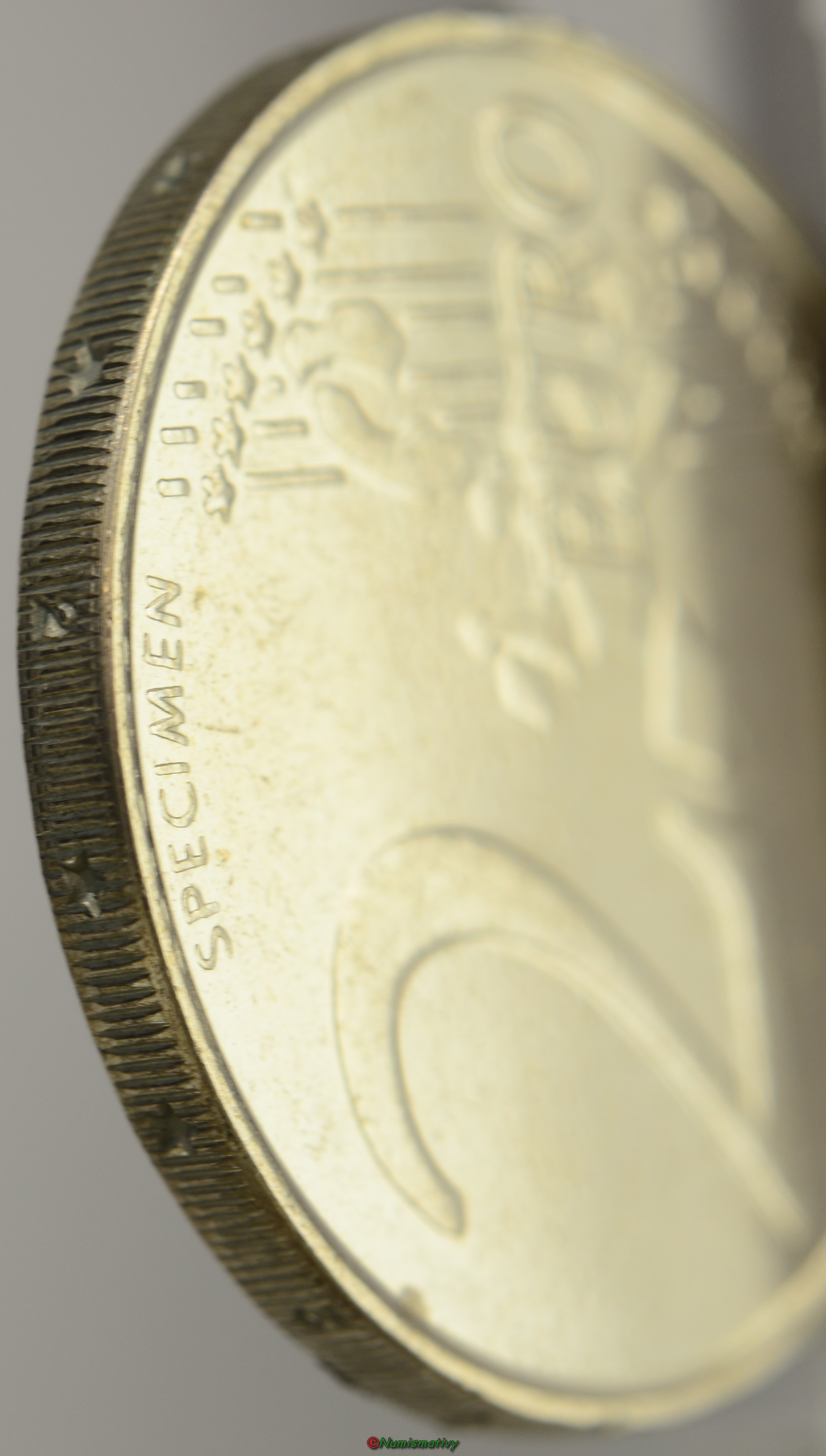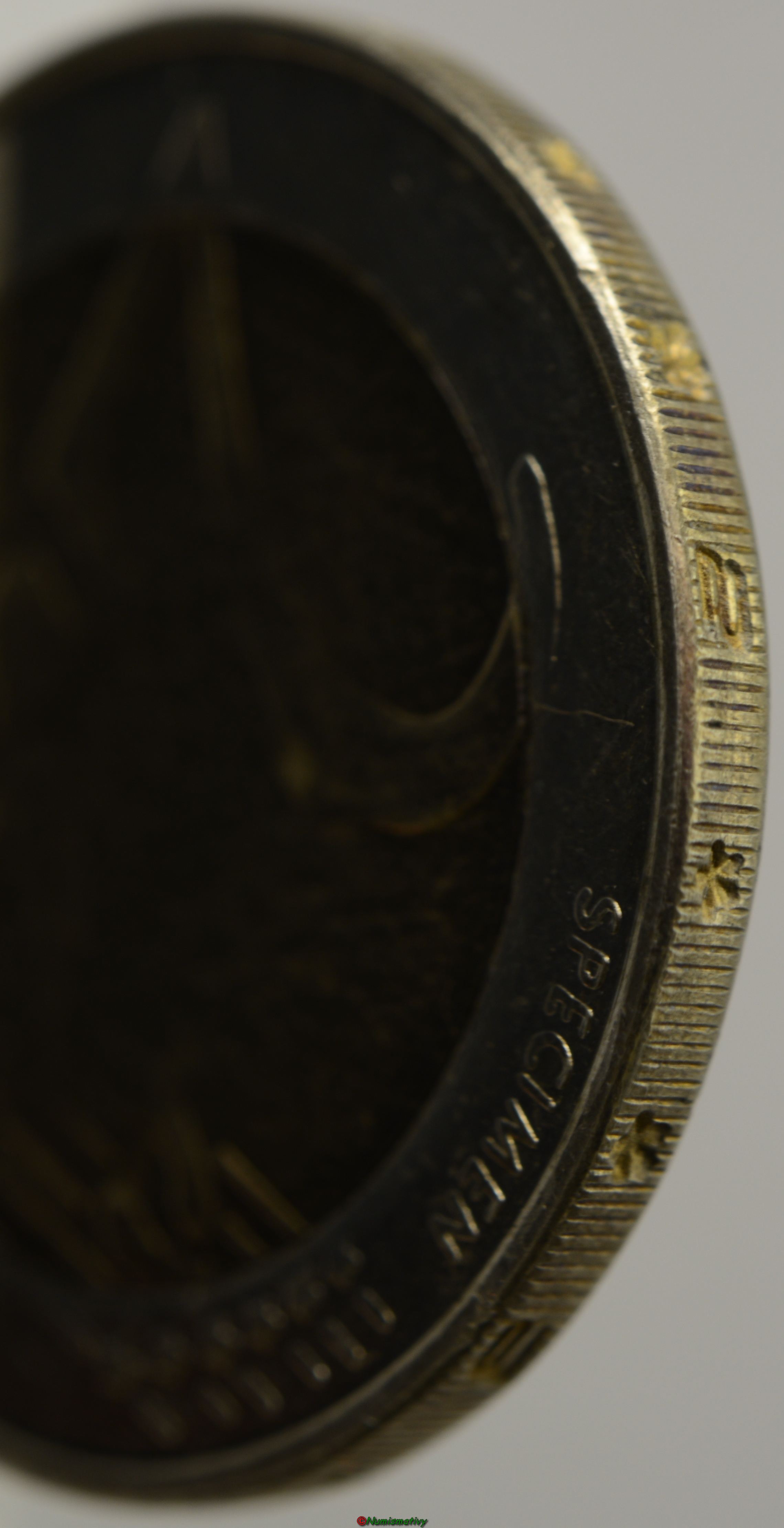 Voici un bel exemplaire avec une tranche de 2 euro, mais frappé sur un flan monométallique. La Birmingham Mint avait pour habitude d'effectuer des frappes d'essais sur des flans monométalliques.