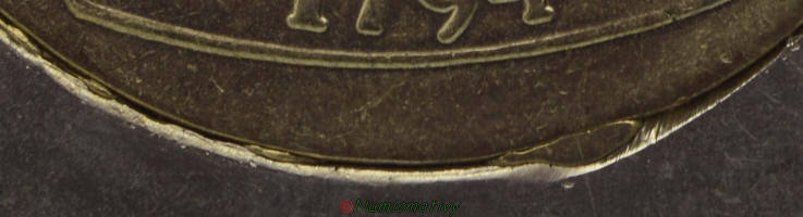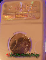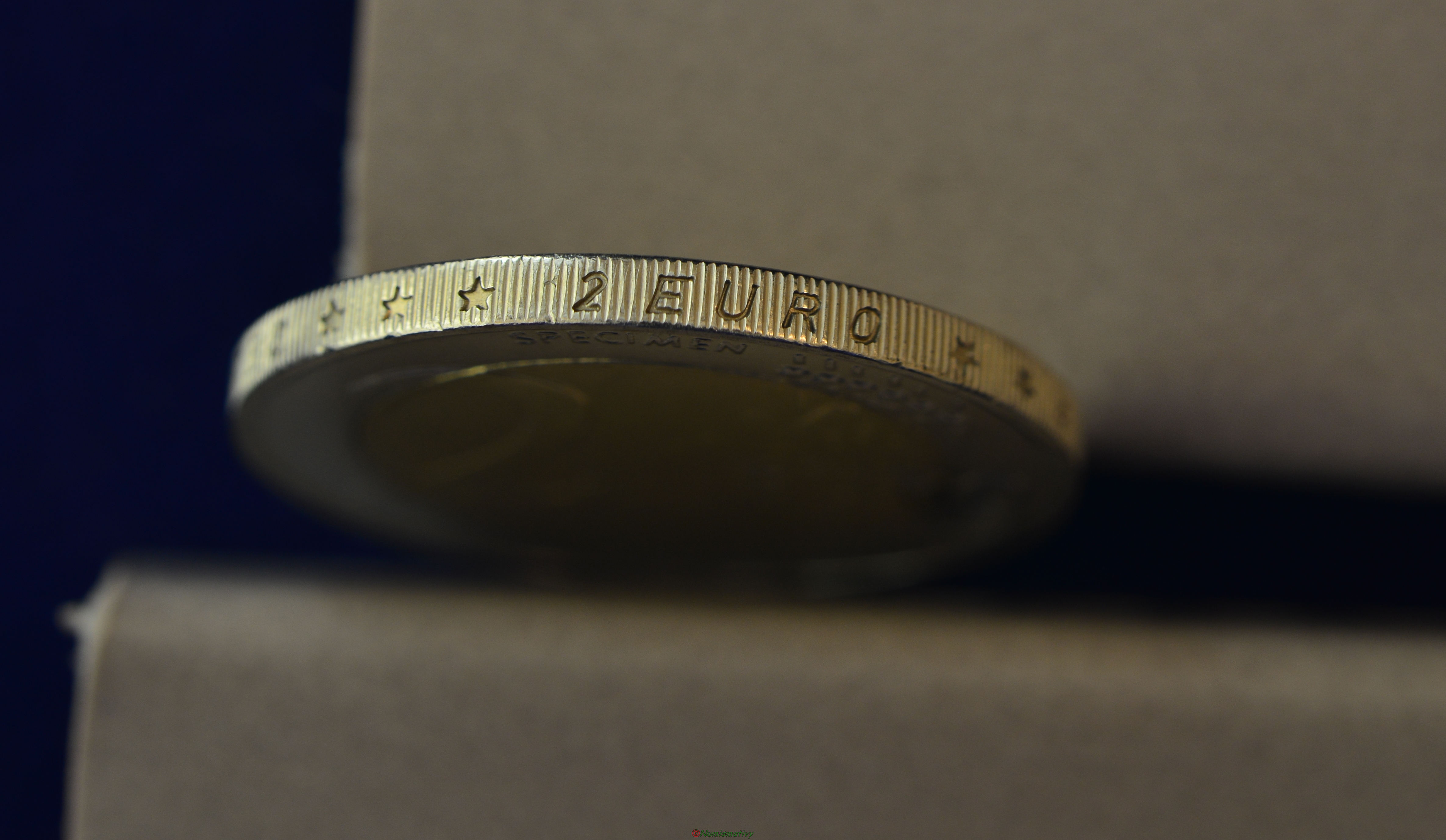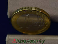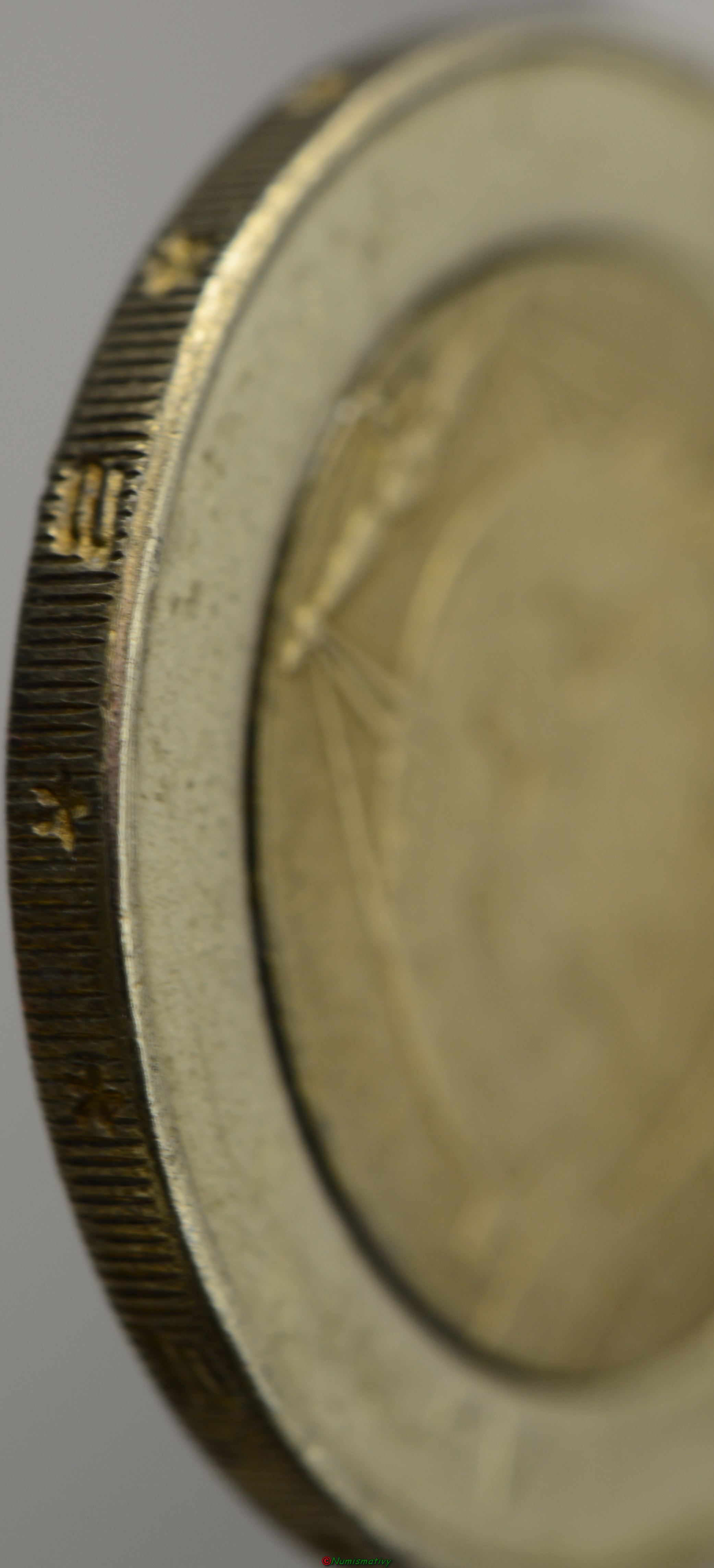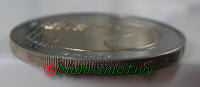 Voici enfin une 2€ avec une tranche autre qu'autrichienne : celle-ci est la tranche de la France, Belgique, ... à ceci près que la police de caractère des 2 ne sont pas conforment au type adopté. On remarque aussi que la frappe est faible et les reliefs peu marqués.