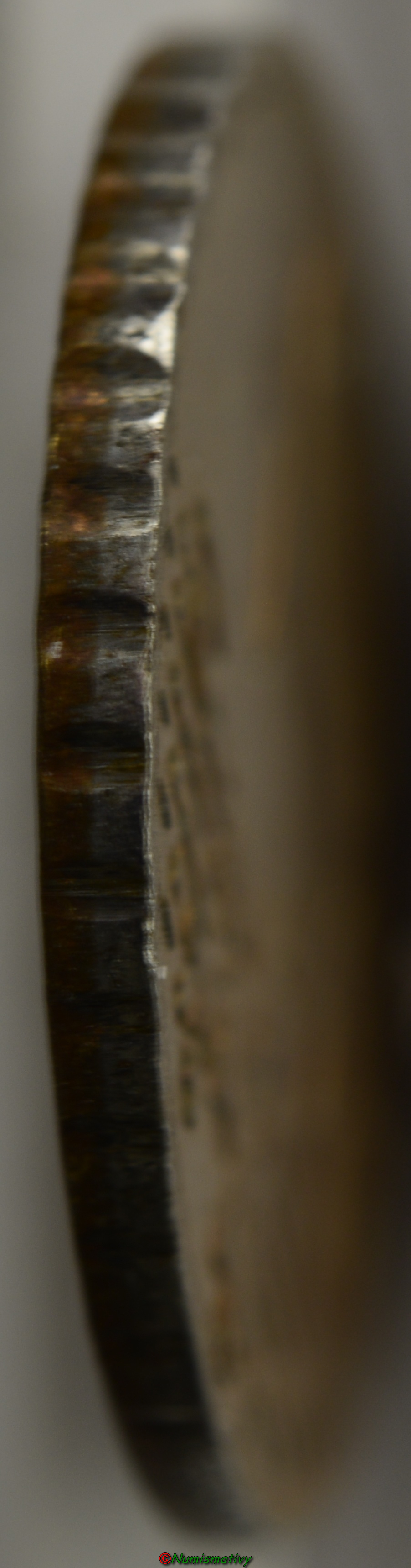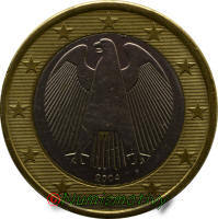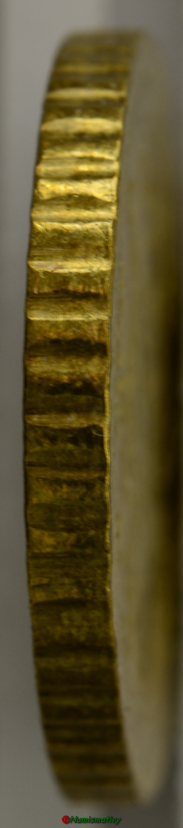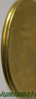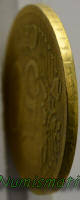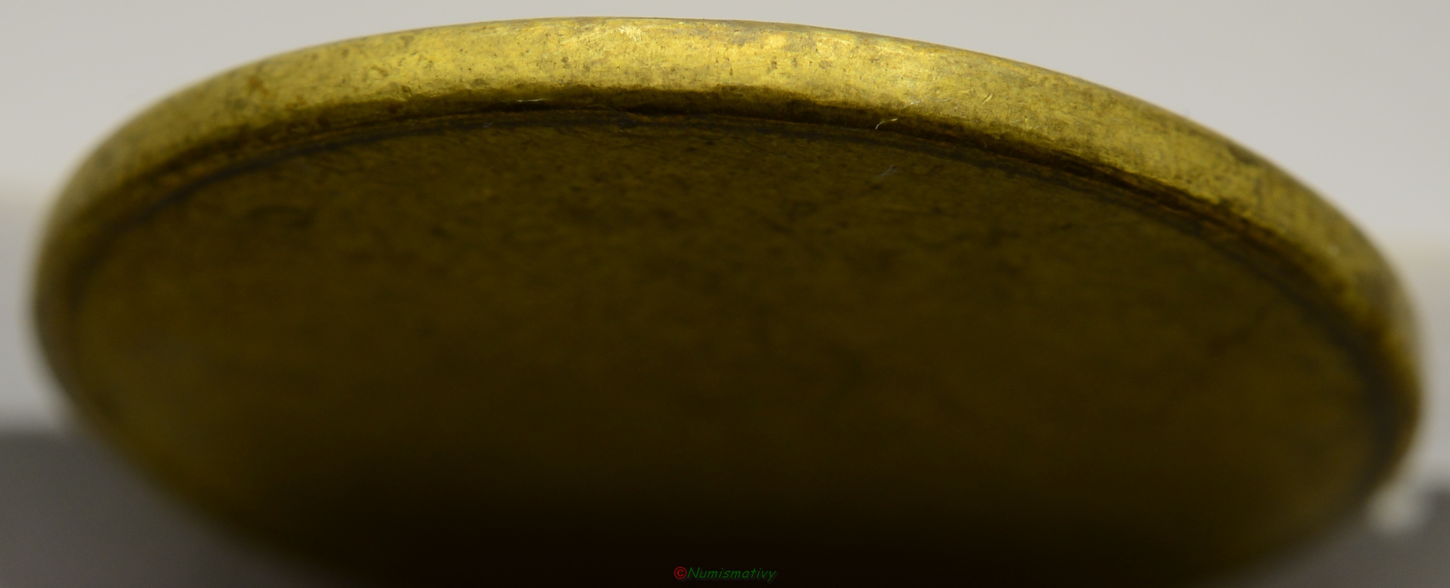 ALLEMAGNE Voici une 10cent 2002D Allemande frappée sur un flan de 5 Pfennig Allemand reconnaissable visuellement par le bandeau non cuivré de la tranche. Poids : 2.95g Flan : magnétique (acier plaqué laiton) |