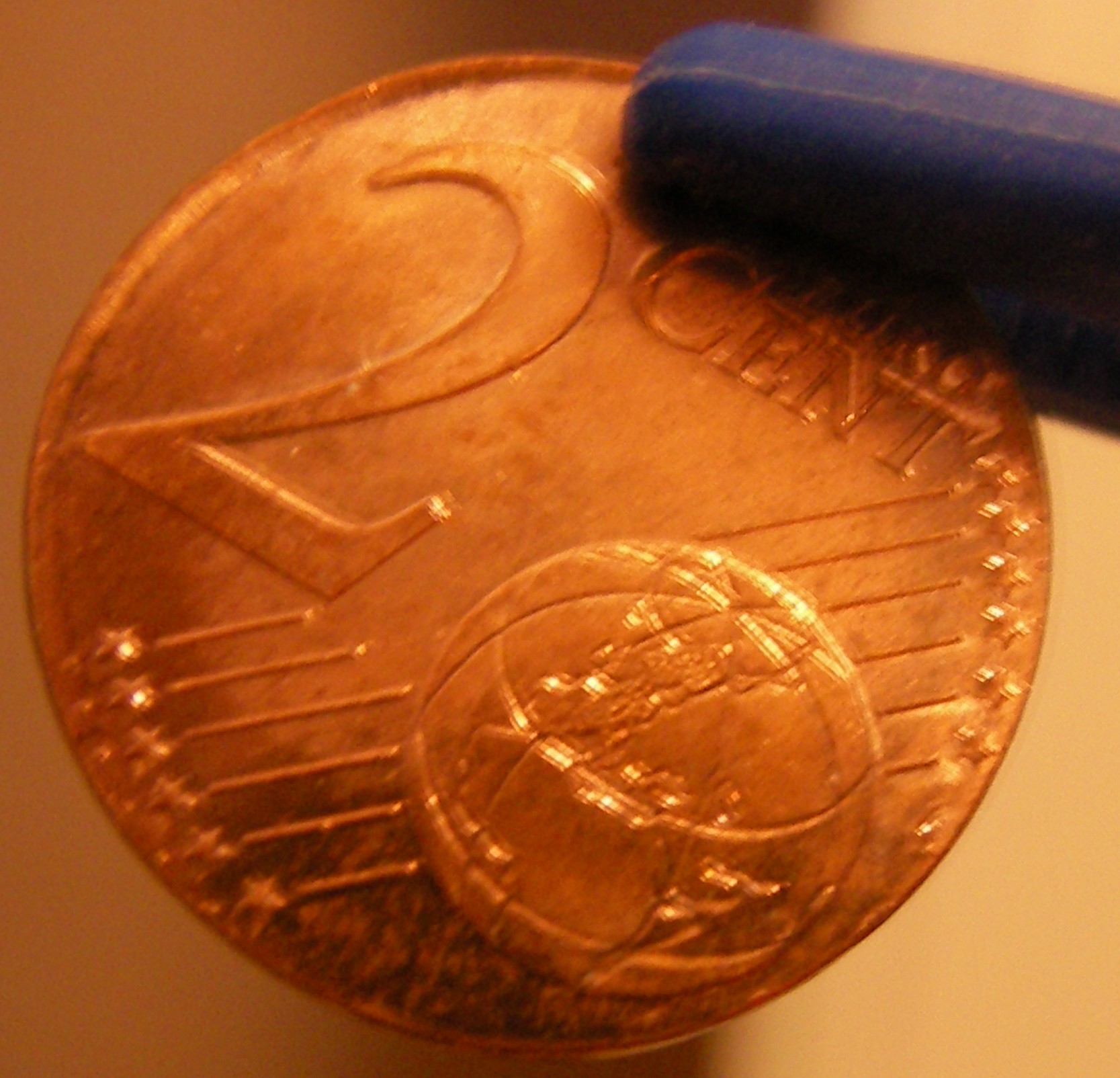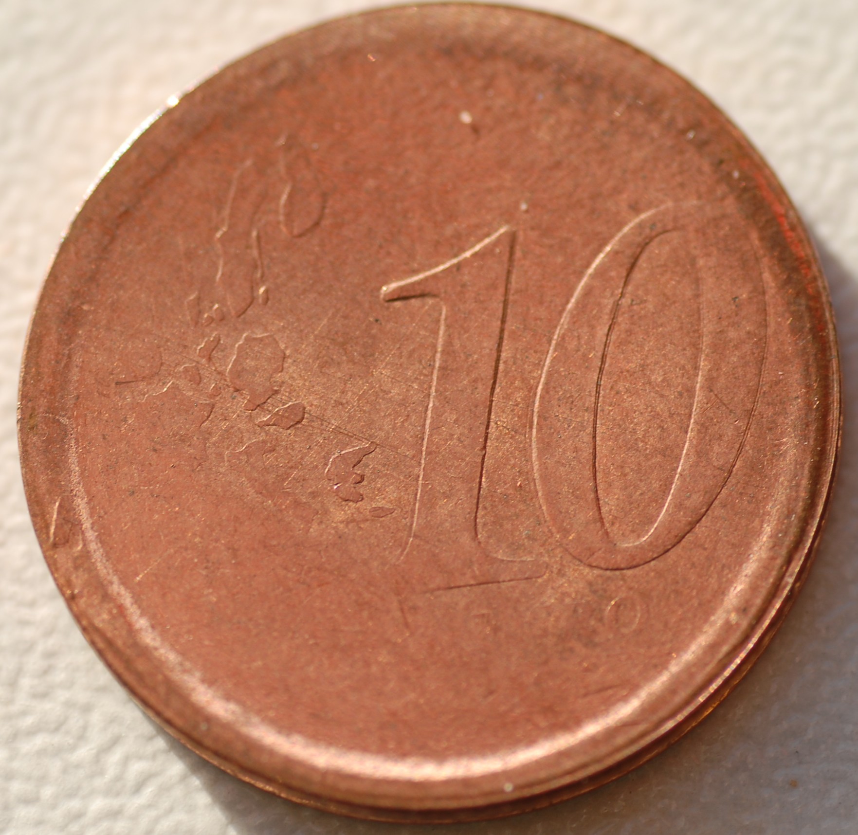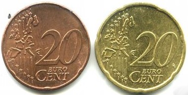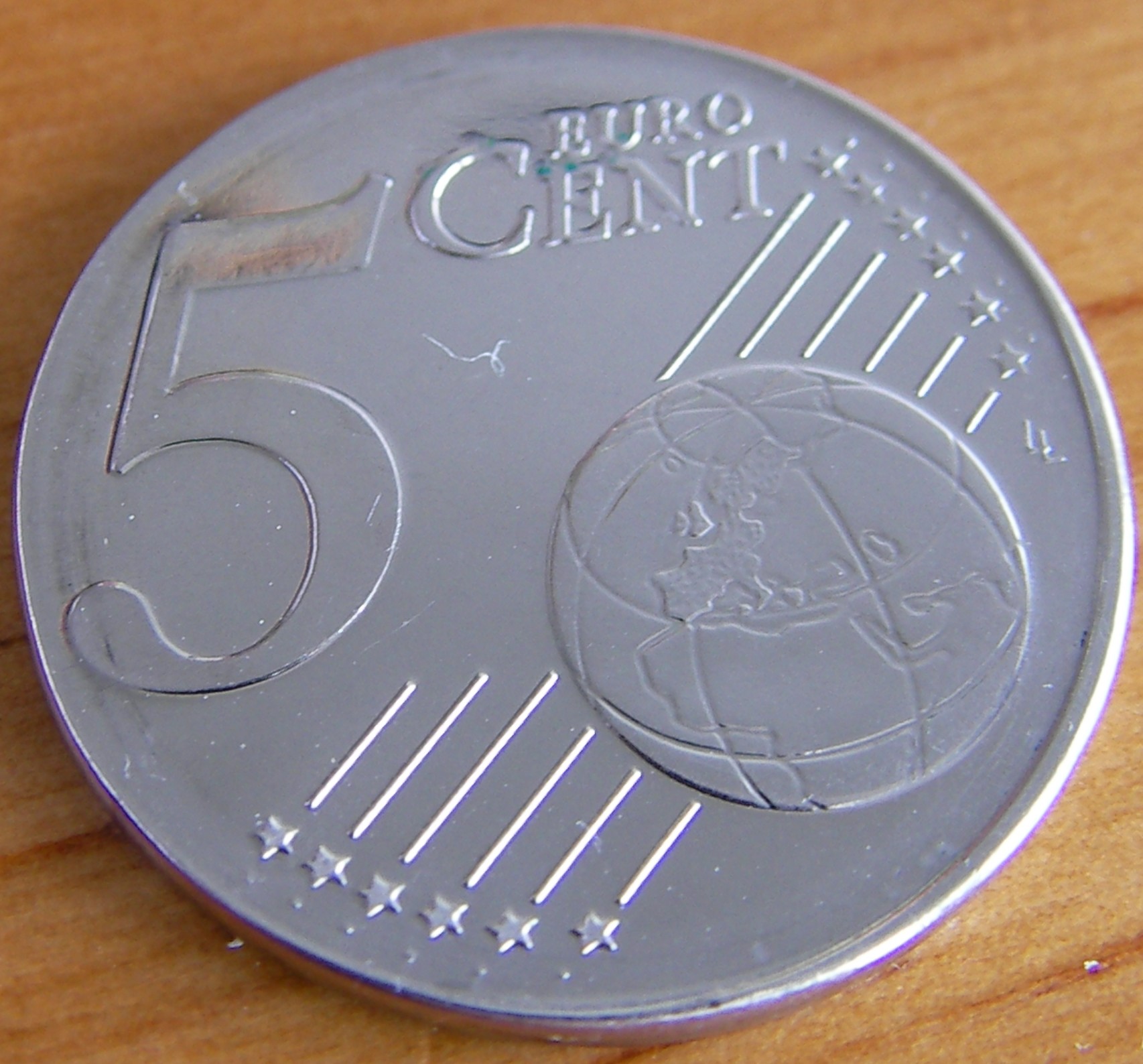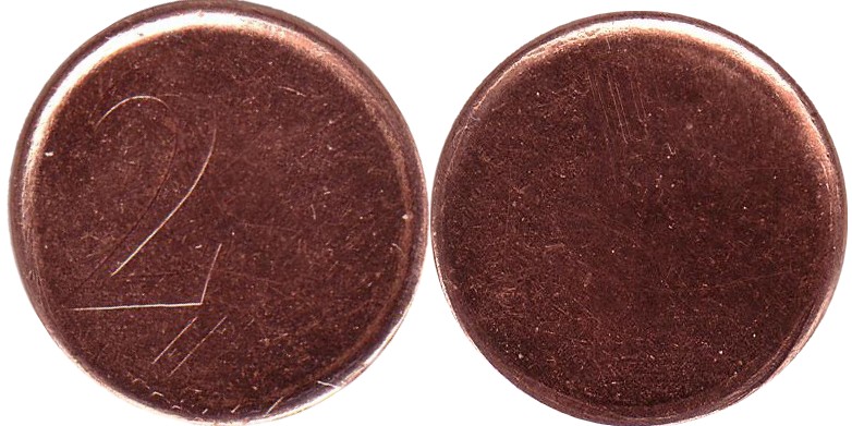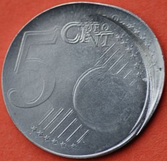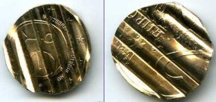 ![]() | Il peut arriver lors des transports entre les différents ateliers de la production qu'un flan de 5cent se retrouve par mégarde dans le bac des 10cent, on donc lors de l'approvisionnement pour la frappe, ce flan non adapté va recevoir l'empreinte d'une 10cent... Ce genre d'erreur donne parfois des résultats surprenants. | ![]() |