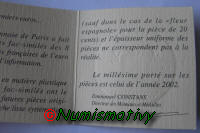 La série est accompagnée d'un certificat indiquant : " La Monnaie de Paris a fait réaliser ces fac-similés des huit futures pièces françaises de l’euro dans un but d’information. Réalisés en matière plastique moulée, ces fac-similés ont le diamètre des futures pièces originales. La tranche lisse systématique (sauf dans le cas de la “fleur espagnole” pour la pièce de 20 cents) et l’épaisseur uniforme des pièces ne correspondent pas à la réalité. Le millésime porté sur les pièces est celui de l’année 2002".