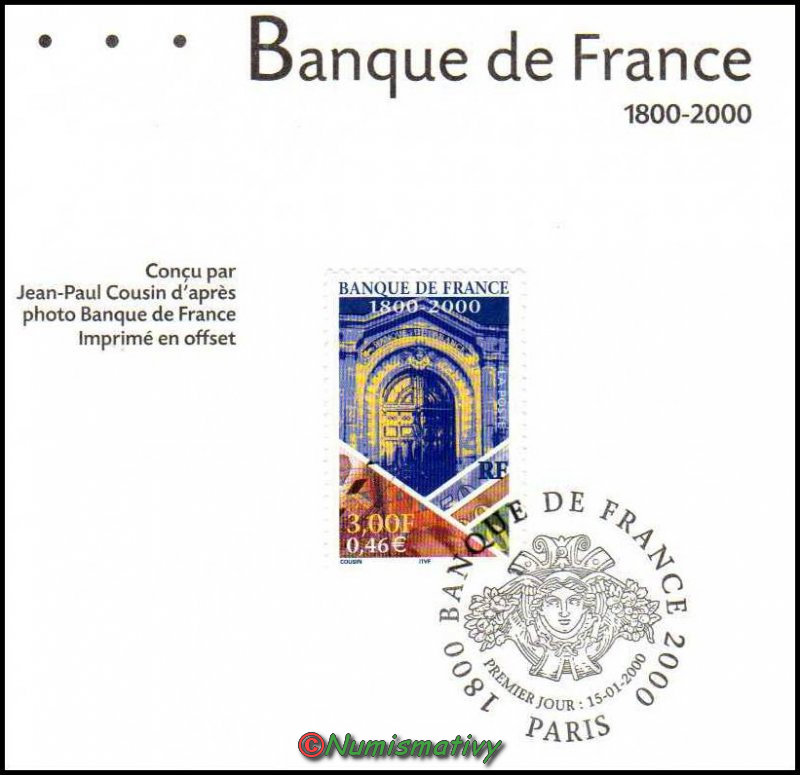 A l'occasion des 200ans de la Banque de France, un timbre à été édité, et une oblitération "premier jour" à été tamponnée sur certains timbres pour cette commémoration.