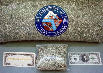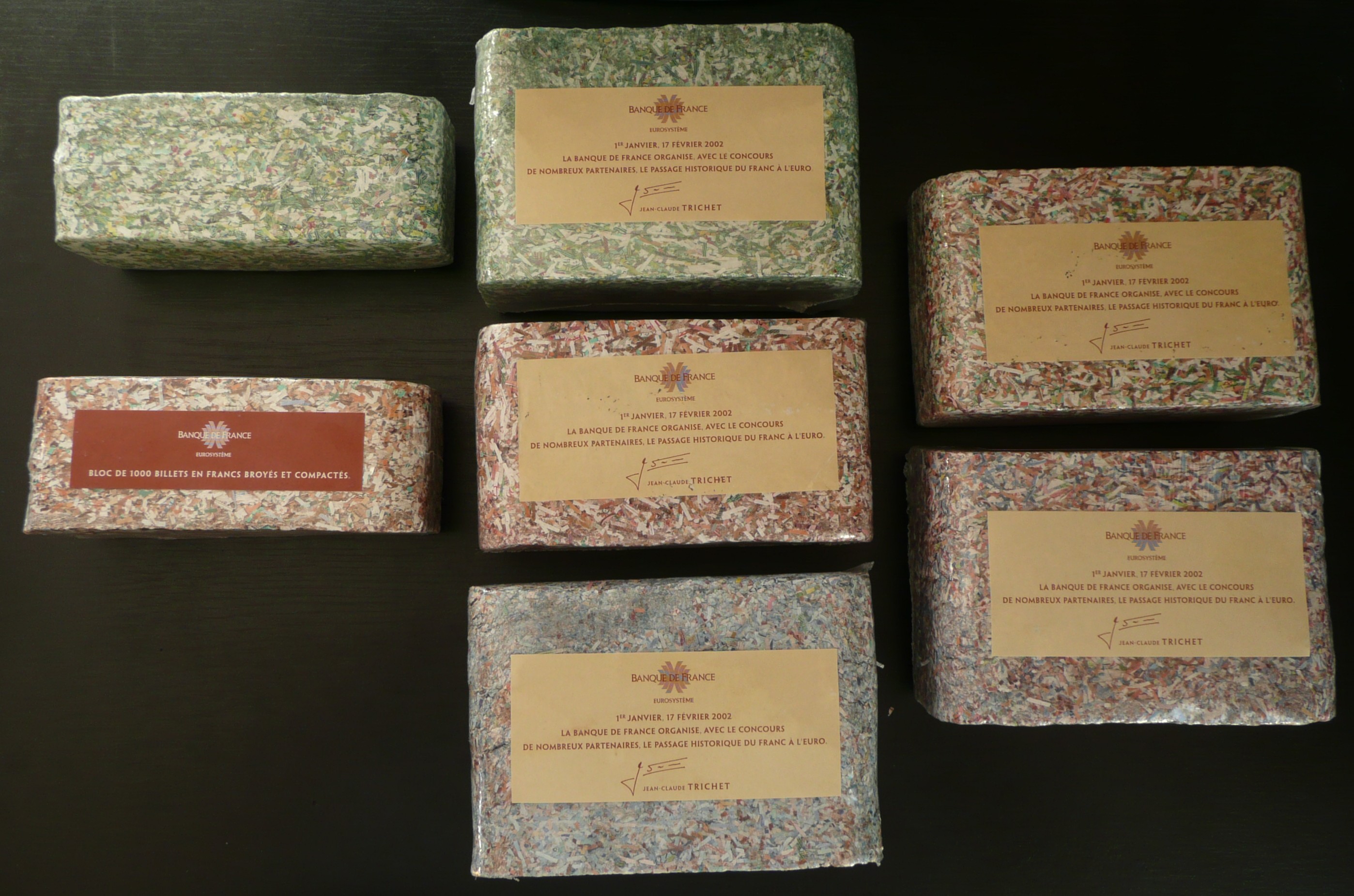 Voyez ces bloc de billets broyés, puis compactés avec une étiquettes avec la signature de Jean-Claude Trichet (alors directeur de la Banque de France en 2002). Pour quelle raison? Simplement pour les offrir (Aux partenaires ayant participés à la mise en place de l'euro et aux cadres supérieurs travaillant à la BdF) , tout en gardant une part de nostalgie sous une forme assez originale !