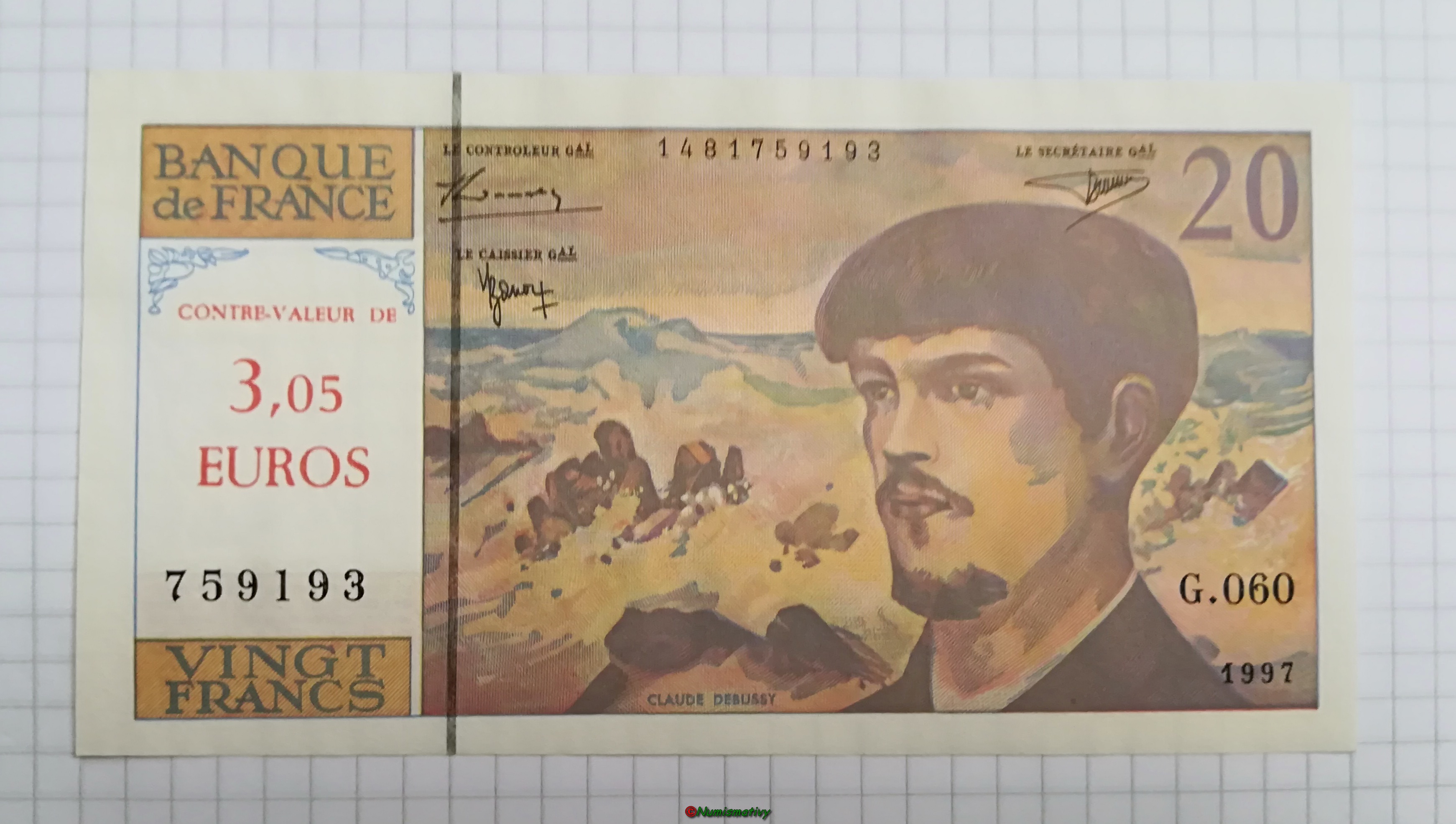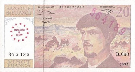 LE 20 Francs Debussy avec surcharge de sa correspondance en EURO : 3.05€