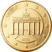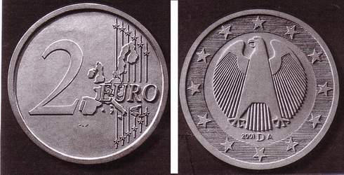 Cette préversion ne comporte pas les lettres des ateliers [A, D, F, G, J] mais l'indication "DA" près de la date, laquelle est désormais centrée sous l'Aigle. On aperçoit également un ovale sous l'Aigle qui fait fortement penser à un hologramme (comme sur les pièces 2€ commémoratives du Traité de Rome du Luxembourg). Aurait-il été question pour les Allemands que les pièces de 1 et 2 euros comportent un tel hologramme, ou cet ovale est-il un simple socle pour l'Aigle ? |